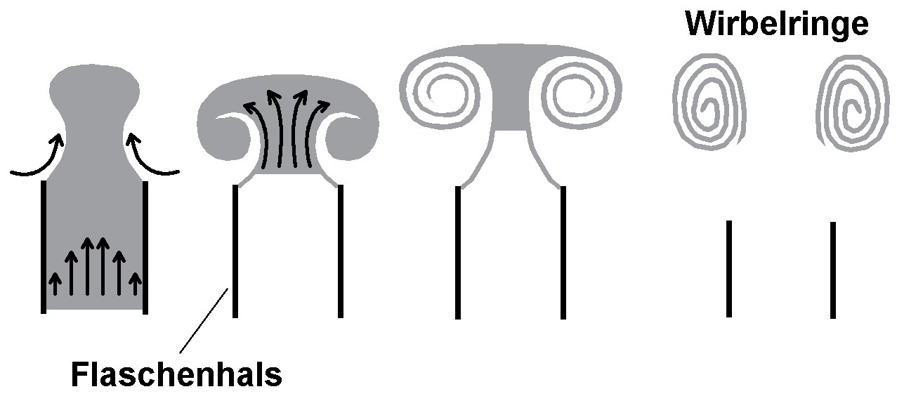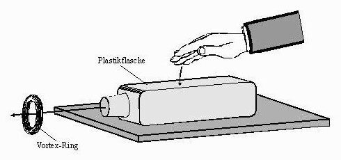Deshalb ist aufgrund des Bernoulliprinzips der Druck im Inneren des Luftstroms kleiner als am Rand, weshalb an der Austrittsöffnung der Flasche Luft von äußen nach innen strömt. Die ausströmende Luft besitzt in Richtung der Symmetrieachse des Flaschenhalses einen relativ großen Impuls. Die an der Austrittsöffnung nach innen fließende Luft wird daher mitgerissen, ohne die Strömung stark zu beeinflussen. Reißt der Luftstrom ab, so wird auch die Luft im näheren Bereich vor der Flaschenöffnung abgebremst. Dadurch verschwindet der Unterdruck vor dem Flaschenhals und die nach innen fließende Luft bewegt sich zu ihrem Herkunftsort zurück. Die dabei entstehende Kreisbewegung erzeugt einen schichtförmig aufgebauten, stabilen und torusförmigen Wirbel, einen sog. Vortex-Ring.