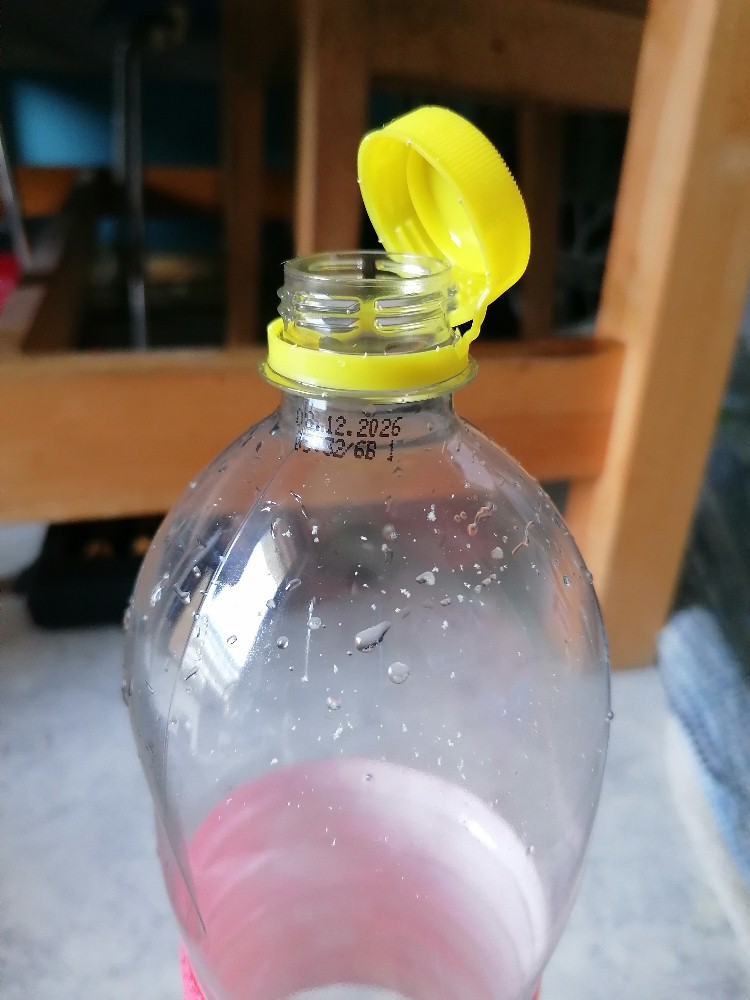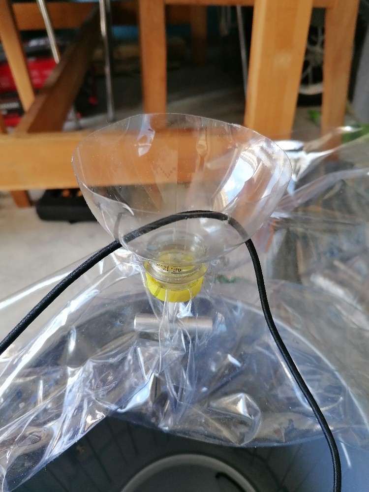 Die Plastiktischdecke muss besonders dünn sein, denn sie wird ohne Loch über den Flaschenhals gestülpt und dann der Deckel mitsamt der Folie festgeschraubt:
