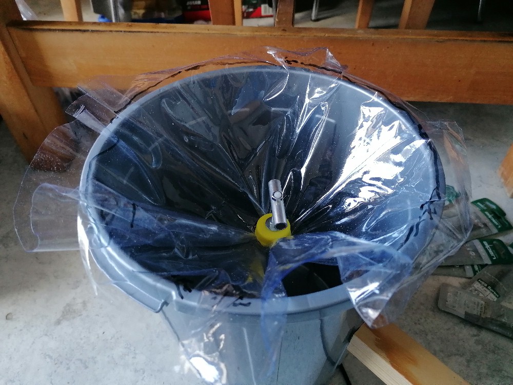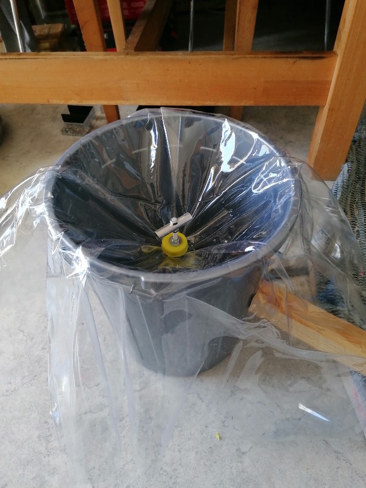 In den Eimerboden muss ein größeres Loch für den Luftauslass geschnitten werden: