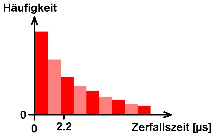 Würde man für viele solcher Ereignisse die zwischen Myon-peak und Elektron-peak vergangene Zerfallszeit in µs notieren und dann die Häufigkeit der Ereignisse gegen die Zerfallszeit auftragen, so könnte man die mittlere Zerfallszeit eines Myons bestimmen. Diese liegt wie schon erwähnt bei 2.2 µs.