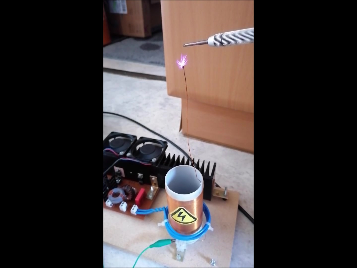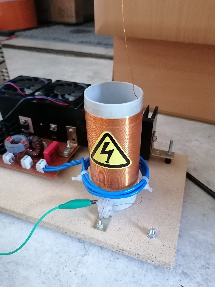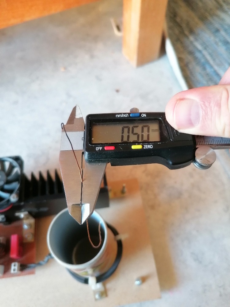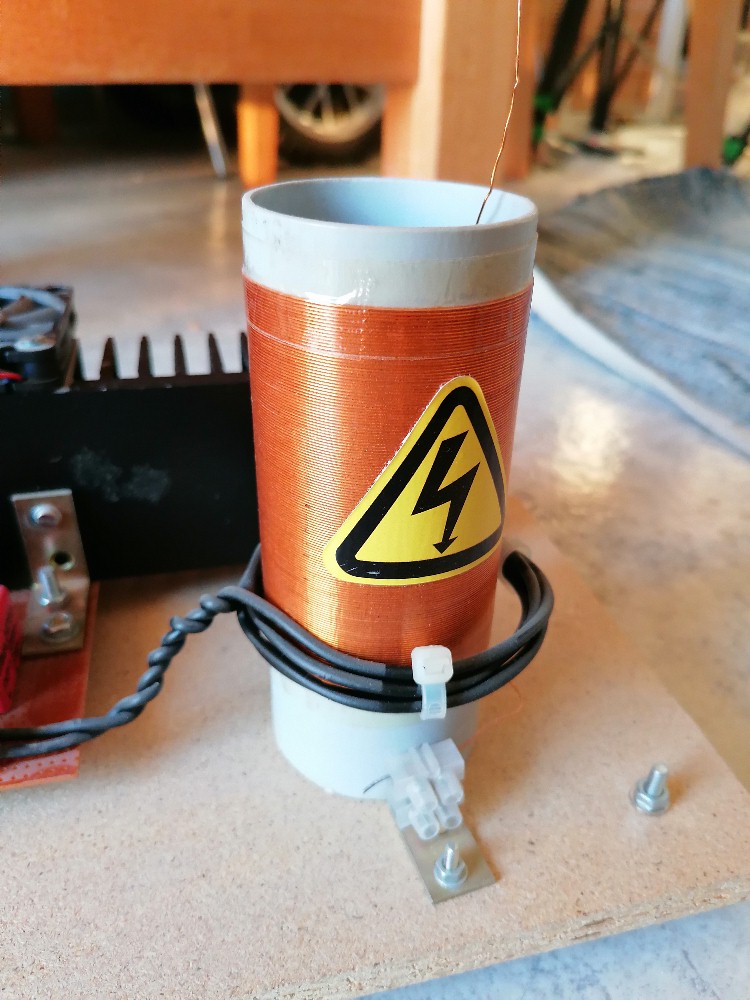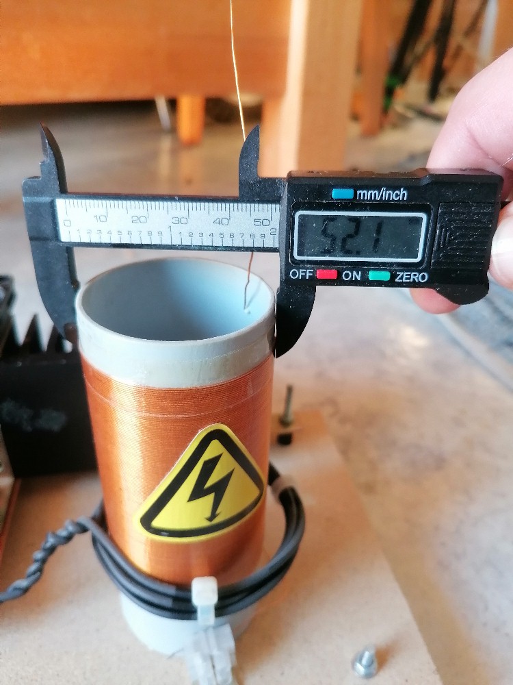Erstens sind die Funken noch recht bescheiden und zudem muss ich die Primärspule um ca. 2 cm relativ zum unteren Spulenende der Sekundärwicklung anheben, damit es überhaupt zu Funken kommt. Dies ist ein Indiz dafür, dass mit der Sekundärspule die Resonanzfrequenz von 4 MHz noch nicht getroffen wird. Die jetzige Sekundärspule besitzt eine Länge von 80 mm, einen Durchmesser von 52 mm und der Kupferlackdraht ist 0.5 mm dick: