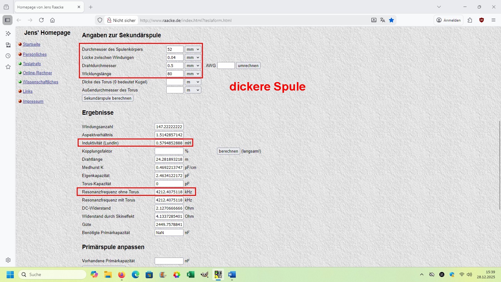 Ich komme konkret auf einen Wert von ca. 4.2 MHz. Jetzt fragt man sich natürlich, warum ich nicht eine Spule mit genau 4 MHz Resonanzfrequenz gewickelt habe? Nun, die von der Sekundärspule erzeugten Funken reduzieren im Betrieb die Resonanzfrequenz um ca. 10-20%. Daher muss man die Spule so konzipieren, dass sie im Nichtbetrieb eine um einiges höhere Resonanzfrequenz besitzt, ca. bei 4.6 MHz.