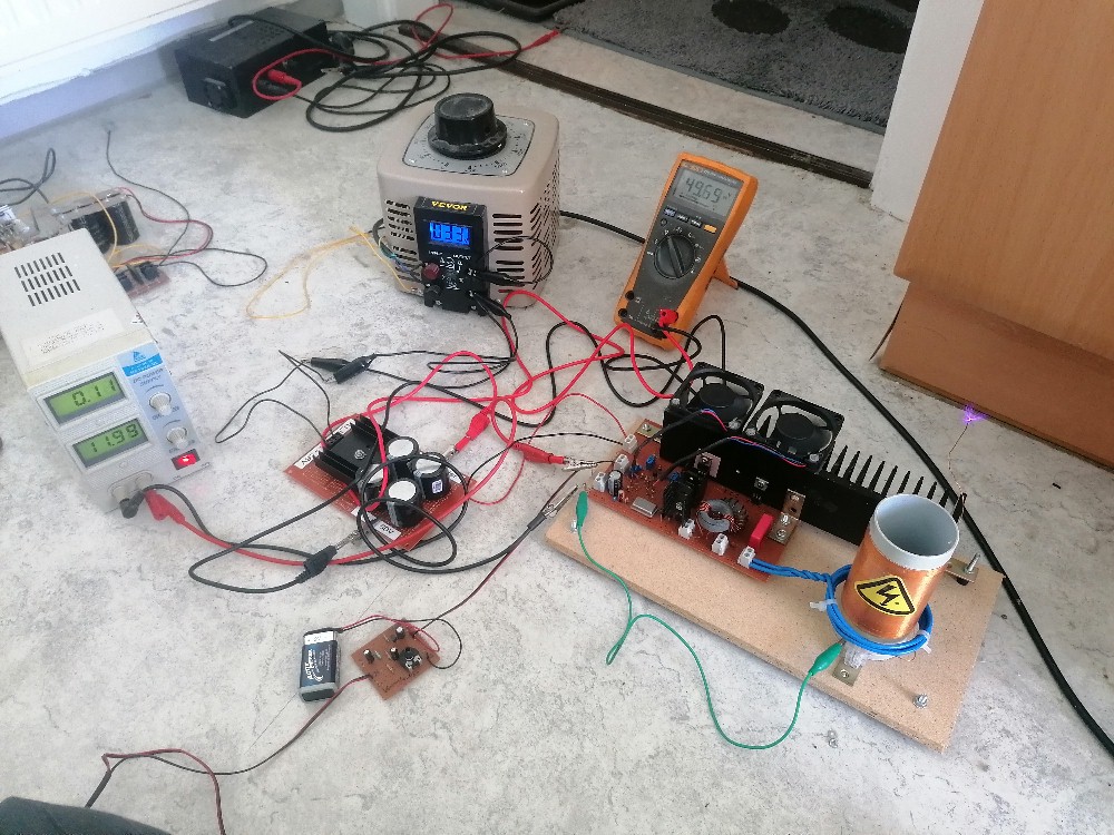 Diese SSTC, deren Schaltplan ich von CTC Labs übernommen habe, läuft mit einer Frequenz von 4 MHz im class E Betrieb. Der Takt wird mit einem Quarzoszillator vorgegeben. Die Betriebsspannen sind einerseits +12V für den Oszillatorteil bzw. 40-50V für den Lastzweig. Ich habe bei dieser Schaltung die Beobachtung gemacht, dass der Leistungsmosfet IRF630 sehr heiß wird. Dadurch benötigte ich auch einen sehr großen Kühlkörper. Diese Teslaspule lässt sich auch Audiomodulieren (siehe Eingang ganz links im Schaltplan). Summa summarum war ich aber doch enttäuscht von der Performance. Eventuell hätte ich mehr Zeit in die Anpassung der Sekundärspule stecken müssen.