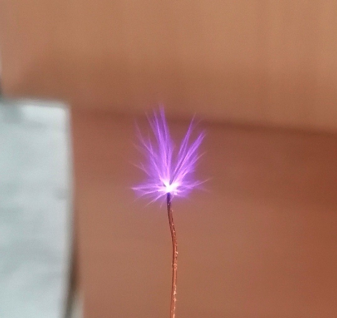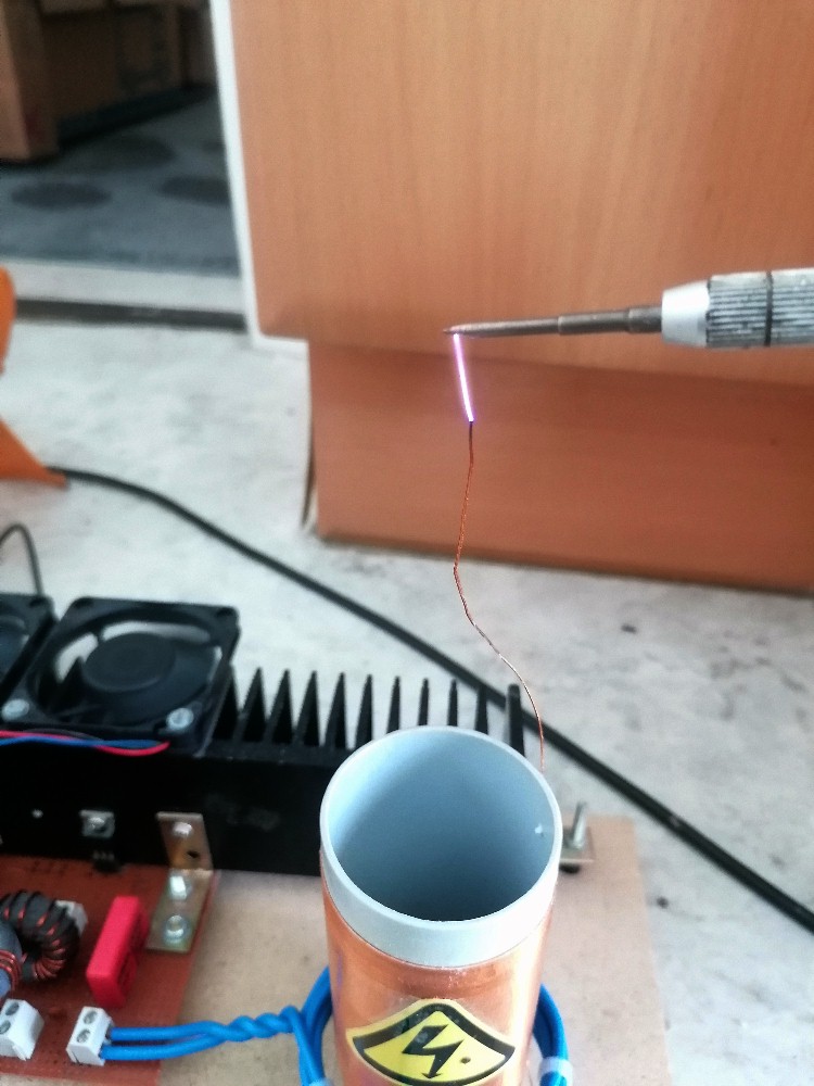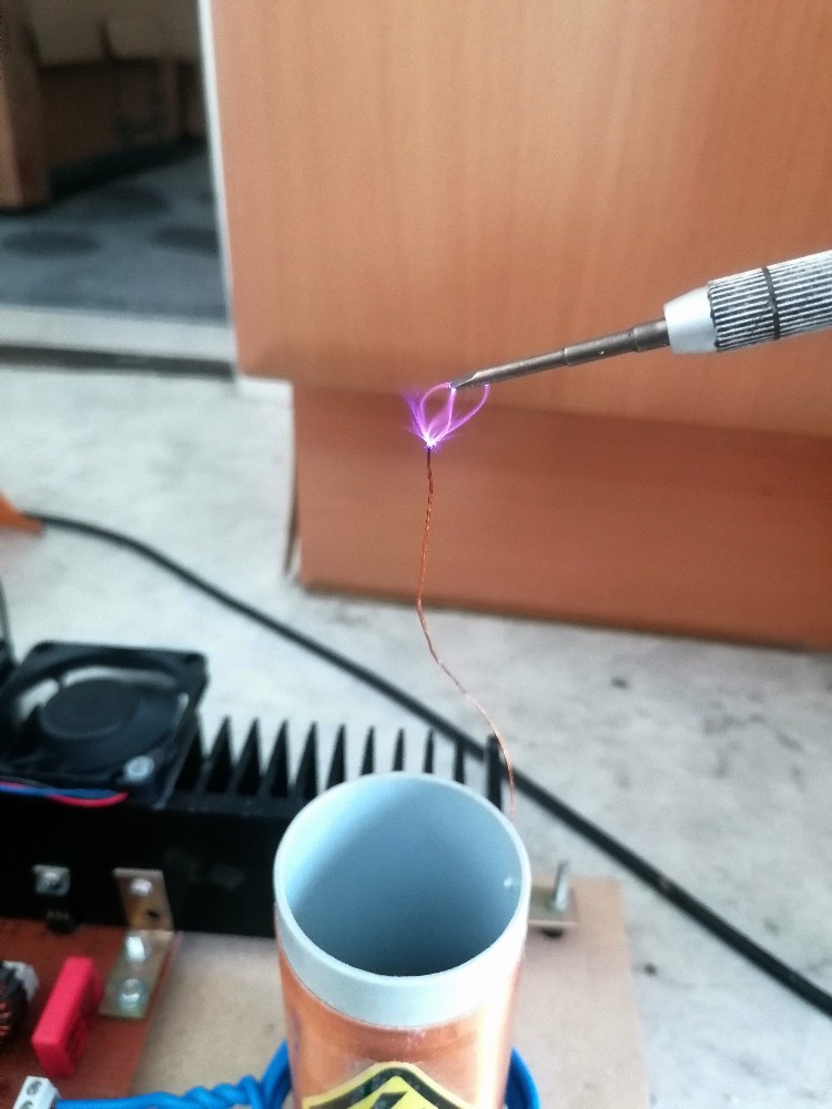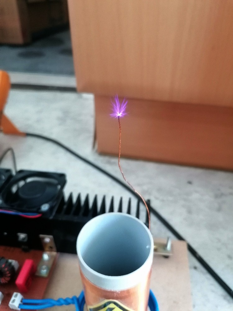 Erstens sind die Funken noch recht bescheiden und zudem muss ich die Primärspule um ca. 2 cm relativ zum unteren Spulenende der Sekundärwicklung anheben, damit es überhaupt zu Funken kommt. Dies ist ein Indiz dafür, dass mit der Sekundärspule die Resonanzfrequenz von 4 MHz noch nicht getroffen wird. Die jetzige Sekundärspule besitzt eine Länge von 80 mm, einen Durchmesser von 52 mm und der Kupferlackdraht ist 0.5 mm dick: