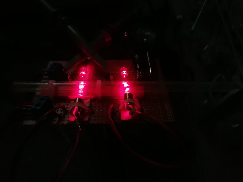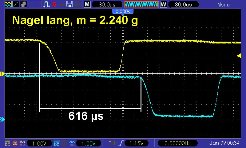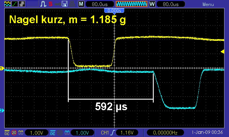 Zunächst habe ich mich um die Bestimmung der Geschwindigkeit in Abhängigkeit von der Projektilgröße gekümmert. Zum Einsatz kam meine simple Laserlichtschranke: