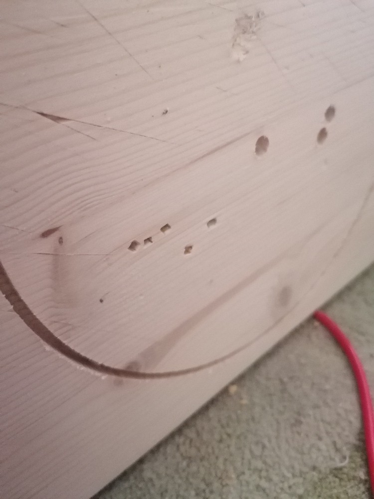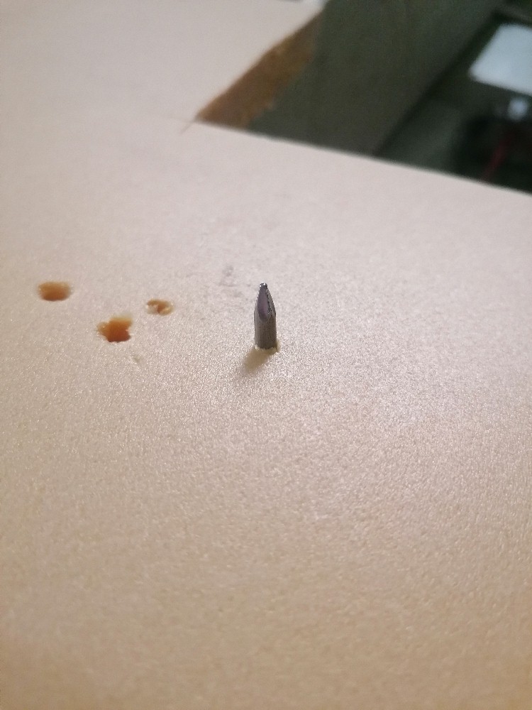 Obwohl die Energien wirklich sehr bescheiden sind ist das Durchschlagsvermögen nicht gerade gering. So durchdringen die Projektile eine 3 cm dicke Hartschaumplatte um dann recht tief in einer Holzplatte stecken zu bleiben: