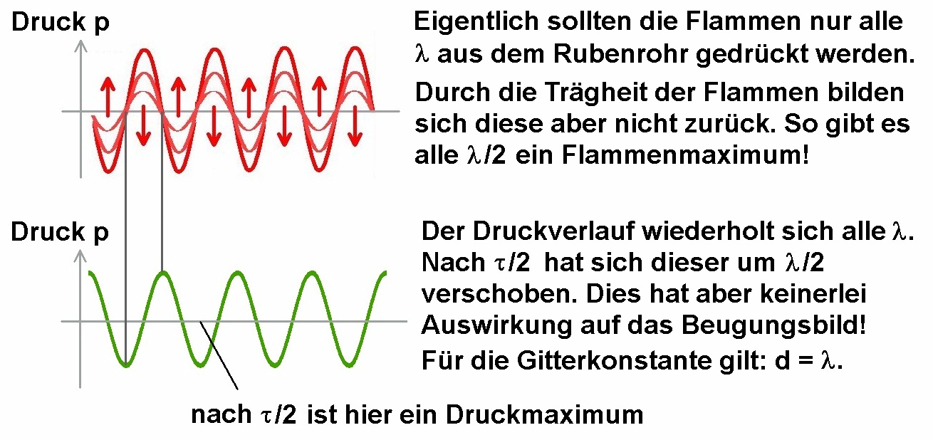 Eine kurze aber wichtige Anmerkung: Beim Kundtschen Rohr besitzen die Flammen durch die stehende Welle alle λ/2 ein Maximum. Der Druckverlauf besitzt aber eigentlich nur alle λ ein Maximum und nach einer halben Periode τ/2 ist an jenem Ort, wo noch kurz zuvor ein Druckmaximum war nun ein Druckminimum. Druckmaximum und -minimum wechseln sich also alle λ/2 bzw. τ/2 sehr schnell ab. Durch die Trägheit der Flammen besitzen diese aber alle λ/2 ein Maximum!