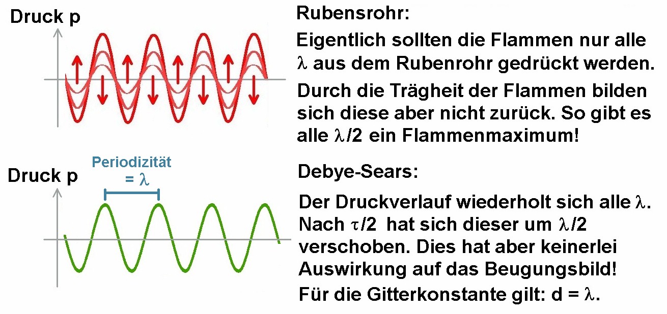 Eine kurze aber wichtige Anmerkung: Beim Rubensrohr besitzen die Flammen durch die stehende Welle alle λ/2 ein Maximum. Der Druckverlauf besitzt aber eigentlich nur alle λ ein Maximum und nach einer halben Periode τ/2 ist an jenem Ort, wo noch kurz zuvor ein Druckmaximum war nun ein Druckminimum. Druckmaximum und -minimum wechseln sich also alle λ/2 bzw. τ/2 sehr schnell ab. Durch die Trägheit der Flammen besitzen diese aber alle λ/2 ein Maximum, d.h. die Flammenperiodizität beträgt λ/2!
