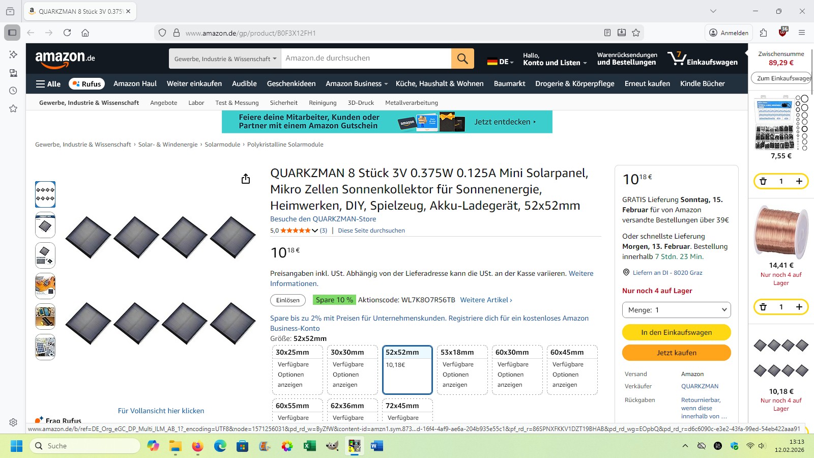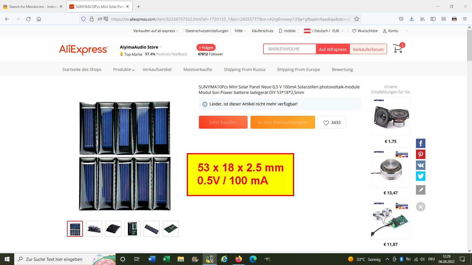 Also Planänderung: Anstelle der viel zu schwachen Solarmodule mit ca. 0.05 W bestellte ich auf Amazon deutlich stärkere mit um die 0.35W.