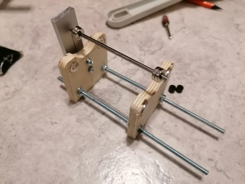 Für die Magnete in der Holzkonstruktion kommen je 3 Stück 10 x 3 mm Scheibenmagnete zum Einsatz. Auf der Messingachse befinden sich je 2 Stück 10 x 3 mm Lochmagnete mit 3 mm Bohrung. Unterhalb des Rotors gebe ich dann einen 30 x 3 mm Zylindermagnet von aliexpress: