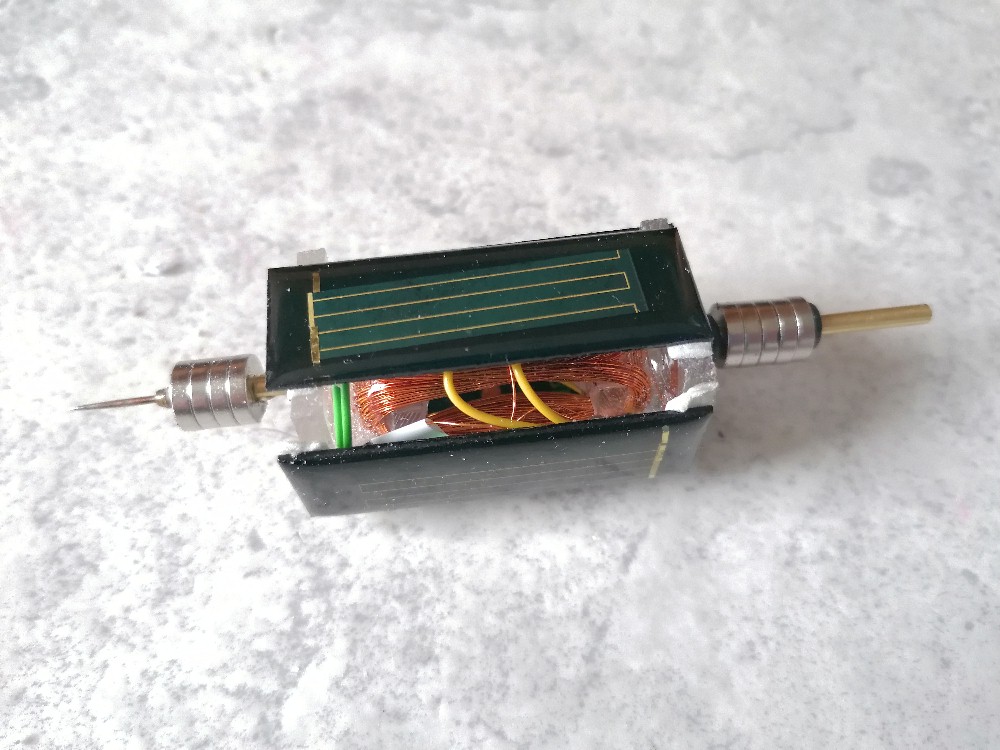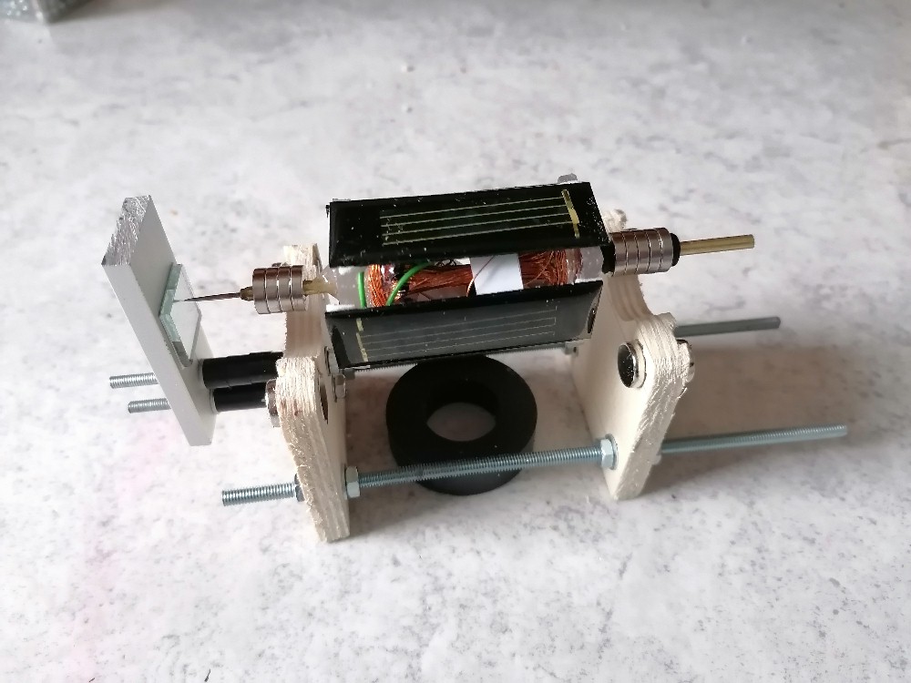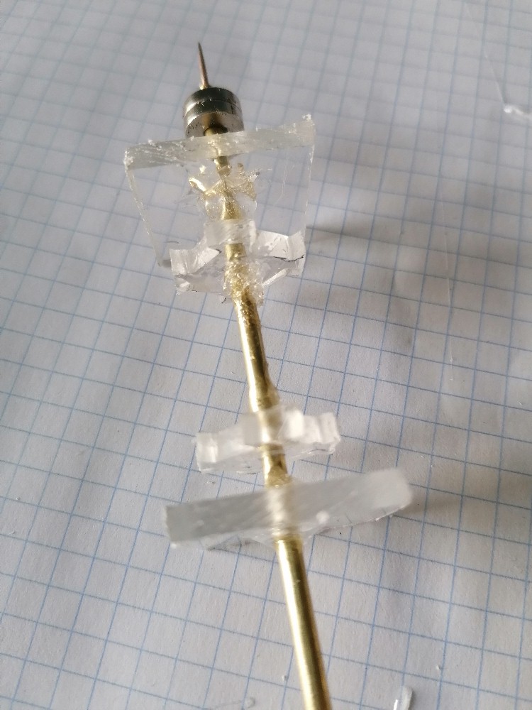 Eventuell montiere ich auf jeder der 4 Seiten zwei Solarzellen nebeneinander, um die Stromstärke und damit das Magnetfeld zu erhöhen. Als Rotationsachse verwende ich ein 3 mm Messingrohr mit 1 mm Wandstärke. Daraus ergibt sich eine 1 mm große Bohrung, in die ich dann eine gekürzte Nähnadel stecke.