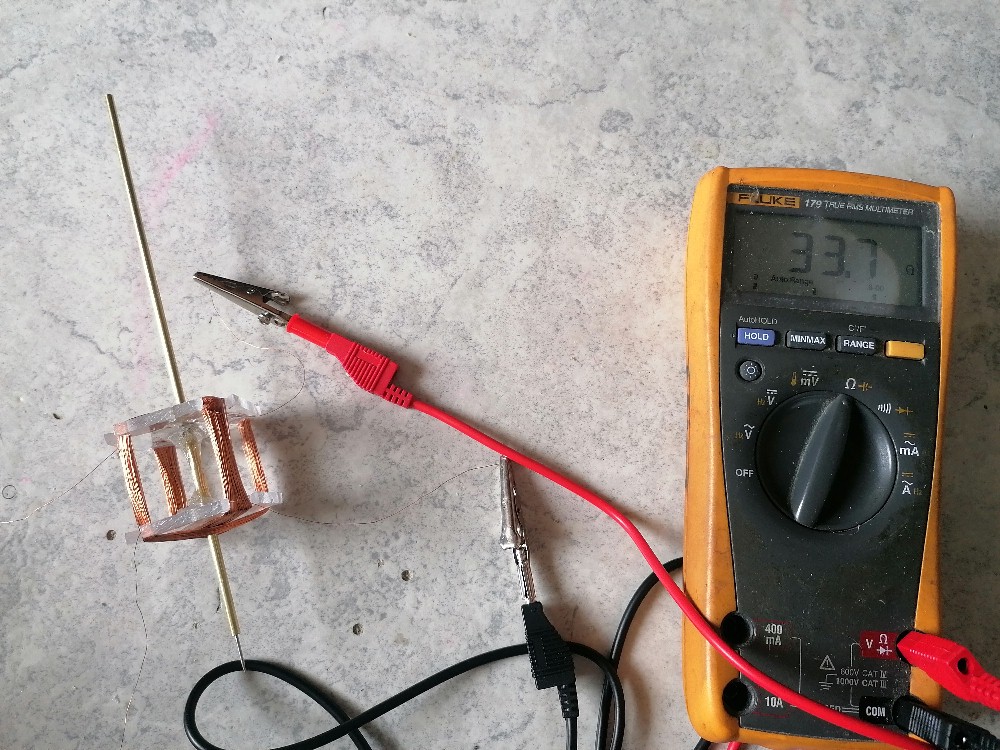Durch den relativ dicken Kupferdraht konnte ich nur 90 Windungen pro Spule anbringen. Dadurch ergab sich ein viel zu geringer Widerstand im Bereich von 2 Ω. Damit waren die leistungsschwachen Solarzellen heillos überfordert und ich konnte den Mendocinomotor mit einer starken Taschenlampe natürlich nicht zum Rotieren überreden…
