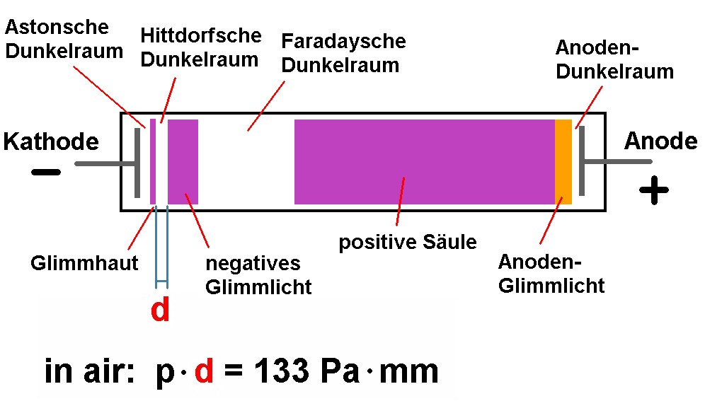 Anhand der entstehenden, schönen Leuchterscheinungen kann auch der Druck abgeschätzt werden. Und zwar nimmt die Breite d des sog. Hittdorfschen Dunkelraums mit abnehmenden Druck p gemäß der Formel für Luft p · d = 133 Pa·mm zu. Bei einem Druck von z.B. 10 Pa müsste dieser Dunkelraum eine Ausdehnung von rund d = 13.3 mm aufweisen.