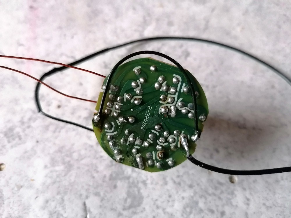 Hier erkennt man den dickeren Kupferlackdraht, der um die bereits bestehende Wicklung der Drossel L1 gewickelt wird: