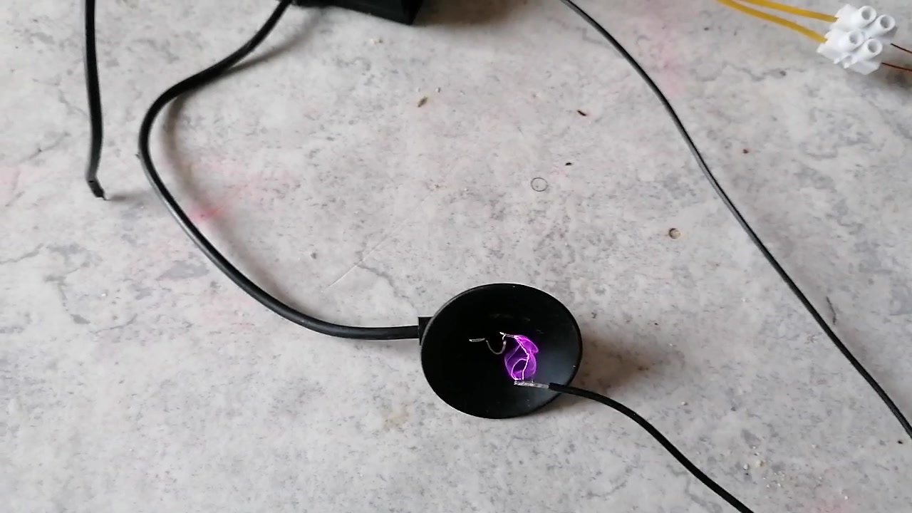 Hier einmal ein erster Test bei einer Eingangsspannung von nur ca. 8V. Man sieht aber, dass der Lichtbogen auch einiges an UV-Licht emittiert, da das darunter befindliche Blatt Papier fluoresziert.