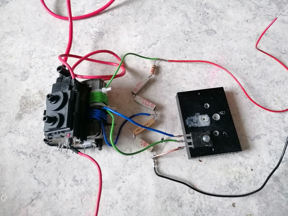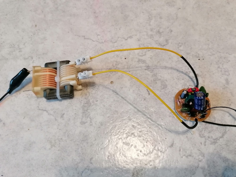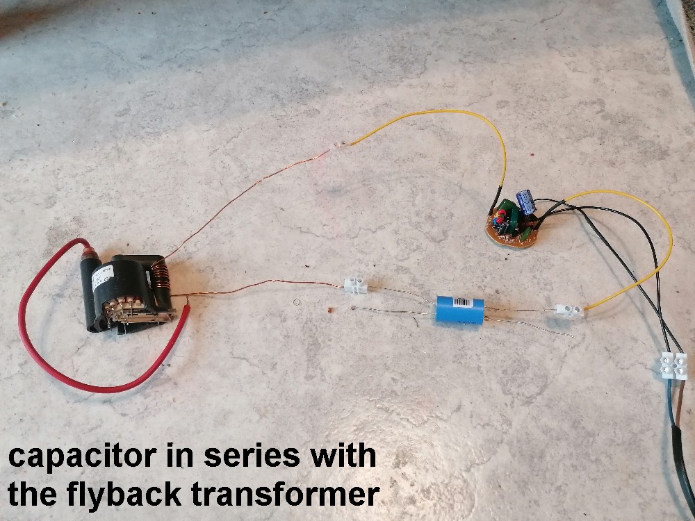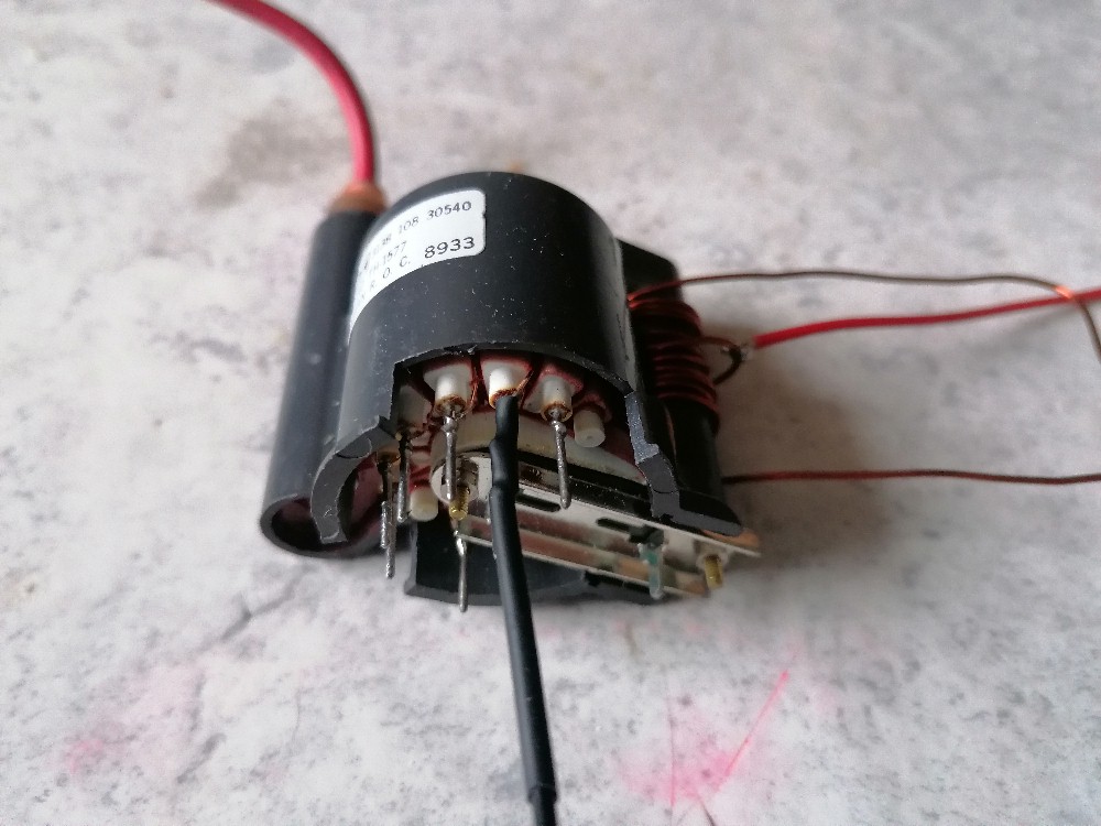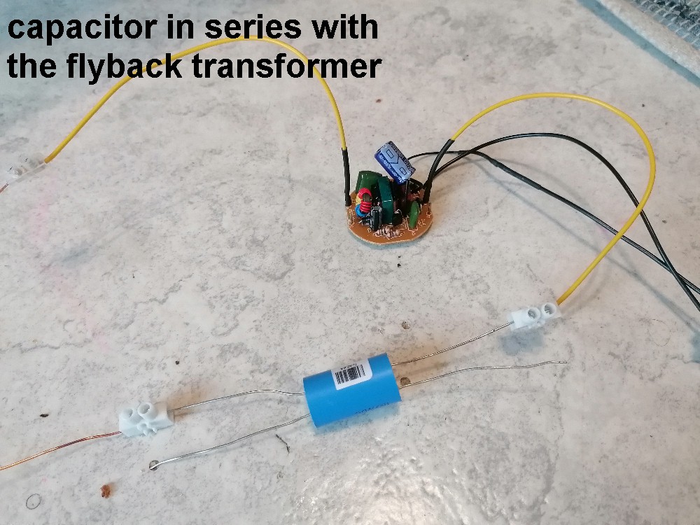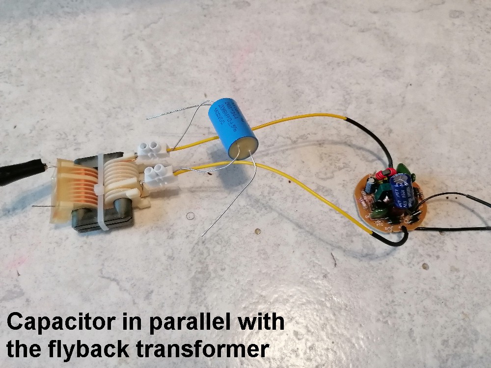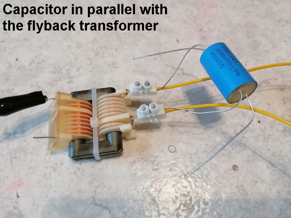 Bei dieser Variante habe ich einen 6.8 nF / 1600 V Folienkondensator parallel zur Primärwicklung des Zeilentrafos angeschlossen. Man hätte natürlich auch Pin 1 mit Pin 2 und Pin 3 mit Pin 4 verbinden können. Dann hätte man den auf der Platine befindlichen Kondensator C3 genutzt. Der Output bei dieser Verschaltung war minimalst. Es war damit gerade so ein nicht einmal 1 mm langer Funken zu erzielen, also unbrauchbar.