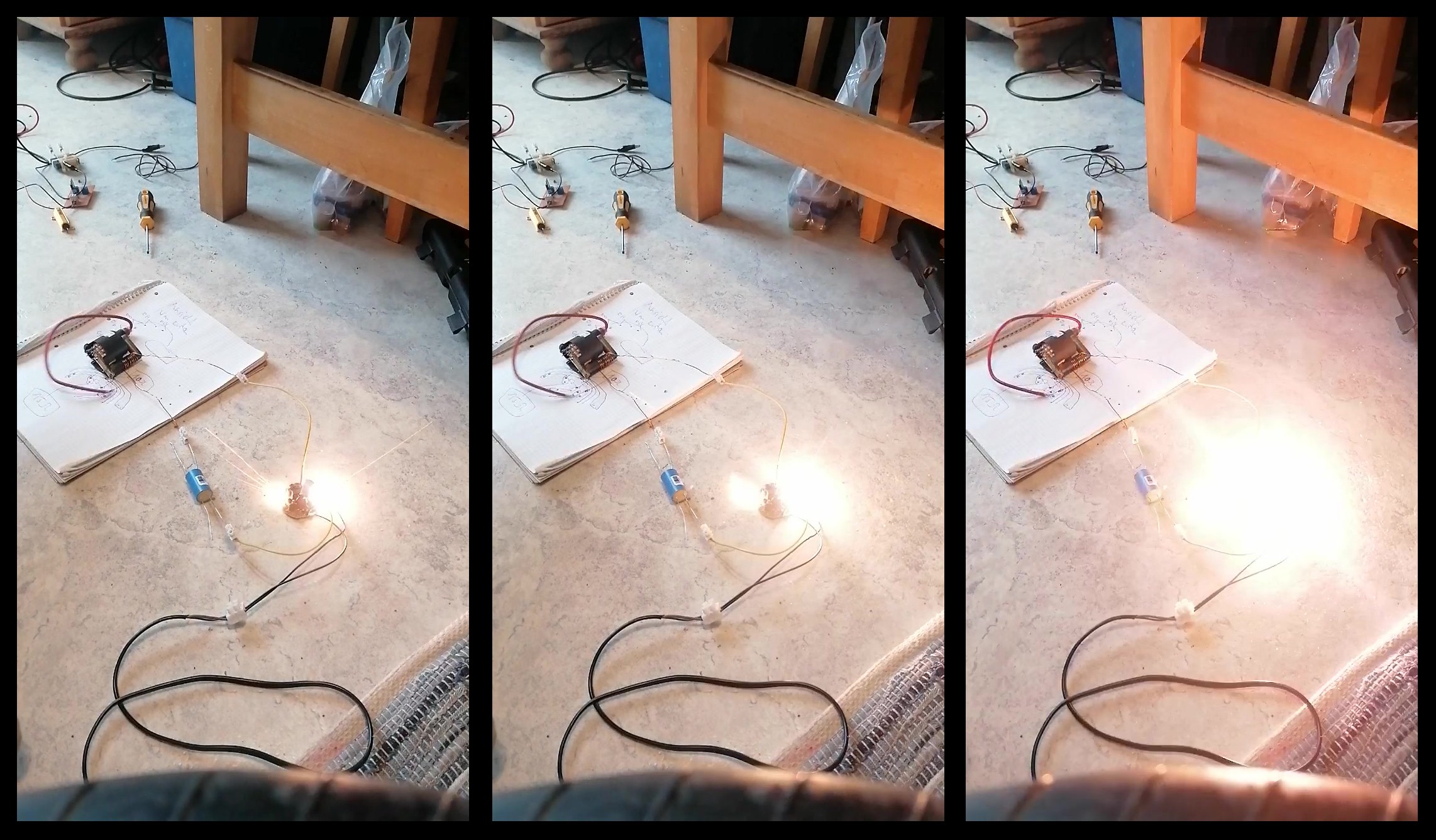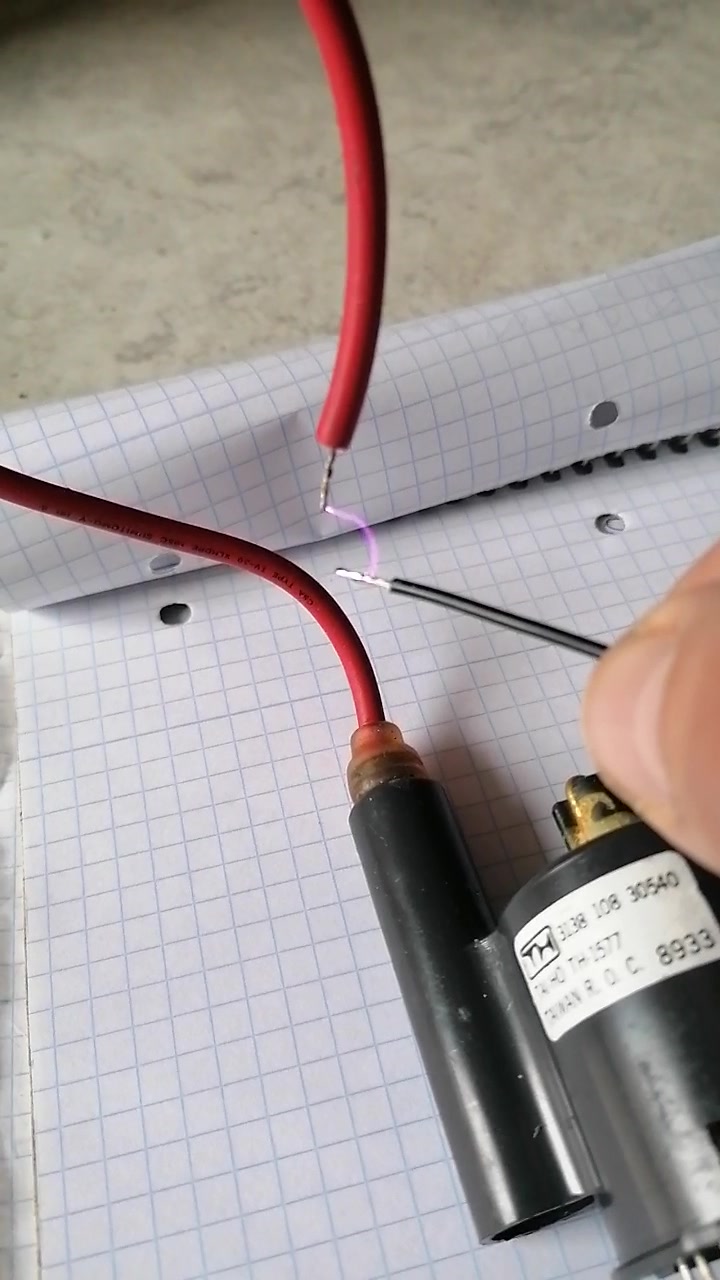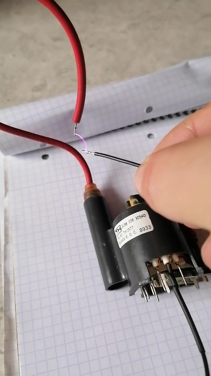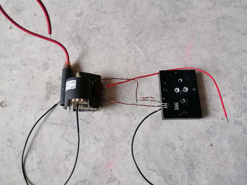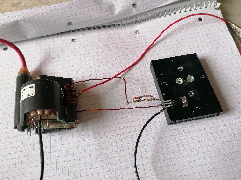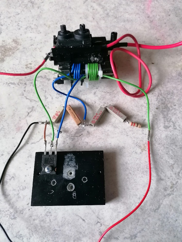 Bei dieser Variante habe ich einen 6.8 nF / 1600 V Folienkondensator parallel zur Primärwicklung des Zeilentrafos angeschlossen. Man hätte natürlich auch Pin 1 mit Pin 2 und Pin 3 mit Pin 4 verbinden können. Dann hätte man den auf der Platine befindlichen Kondensator C3 genutzt. Der Output bei dieser Verschaltung war minimalst. Es war damit gerade so ein nicht einmal 1 mm langer Funken zu erzielen, also unbrauchbar.