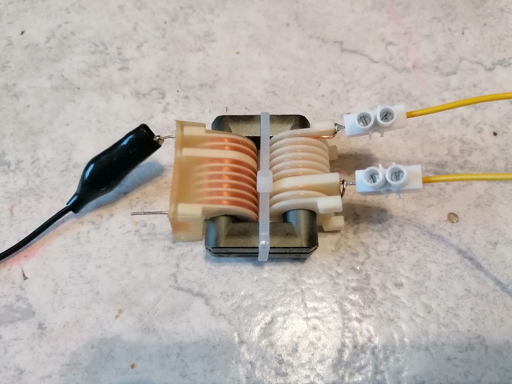 Bei dieser Variante kommt kein Kondensator zum Einsatz und ich verbinde die Primärwicklung des Zeilentrafos einfach mit den Pins 1 und 4. Der Output war unverändert nahezu 0, also ebenfalls unbrauchbar!