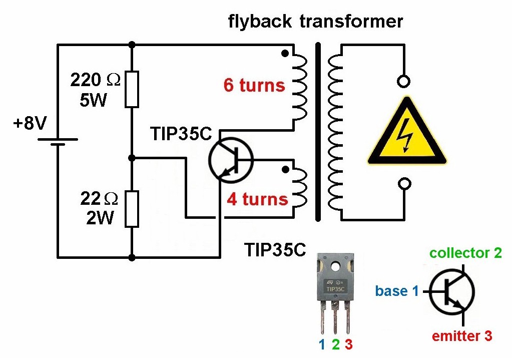 Eine einfache Treiberschaltung für einen Zeilentrafo hätte ich noch. Benötigt wird ein TIP35C oder der gute alte 2N3055 und zwei Lastwiderstände mit 220 Ω (5W) und 22 Ω (2W):