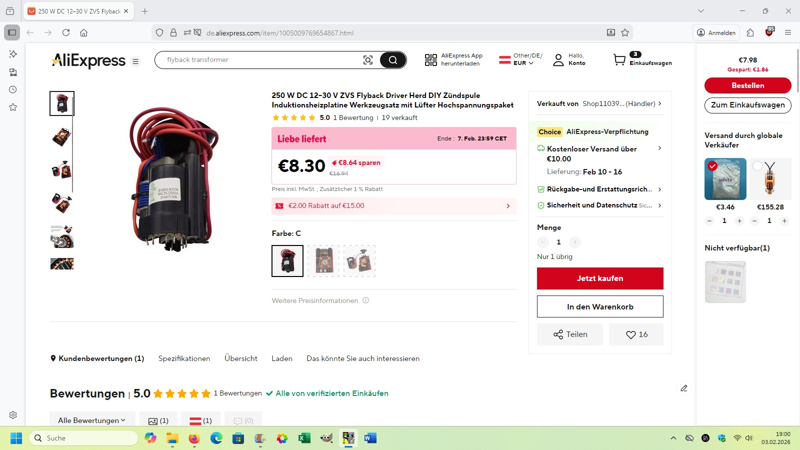 Das zweite Modul sieht um einiges komplexer bzw. leistungsstärker aus, kostet aber auch gut das 7-fache. Laut Hersteller kann es mit einer Gleichspannung zwischen 7 und 28 V betrieben werden. Ich würde aber nur bis maximal 18V gehen. Die Sekundärwicklung ist aber schön vergossen. Von daher traue ich dieser Variante eine etwas längere Lebenszeit zu.
