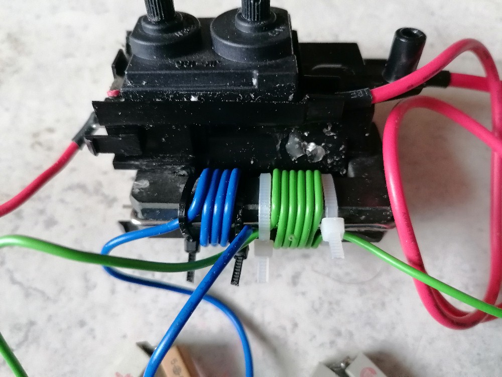Hier erkennt man gut die Feedbackwicklung mit 4 Windungen (blau) und die Primärwicklung mit 6 Windungen (grün):