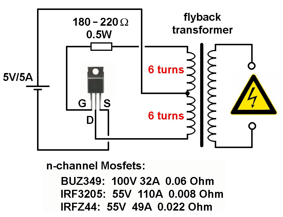 Wer auf der Suche nach einer möglichst einfachen HV-Schaltung ist der wird hier fündig. Der Treiber besteht lediglich aus 2 Komponenten, einen N-channel Mosfet (z.B. IRF3205) und einen Gatewiderstand (180 – 220 Ω, 0.5 Watt). Der extrem simple Schaltplan: