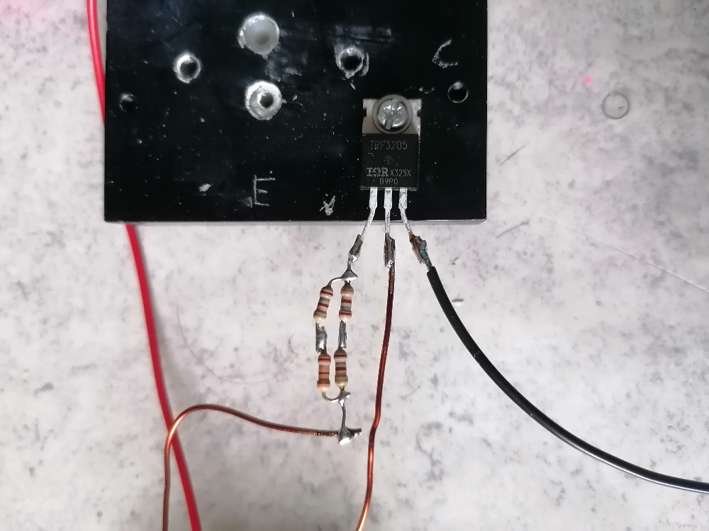 Ich habe für den Gatewiderstand einfach 4 Stück 220 Ω Widerstände mit je 1/4 W in Serie und dann parallel verschaltet: