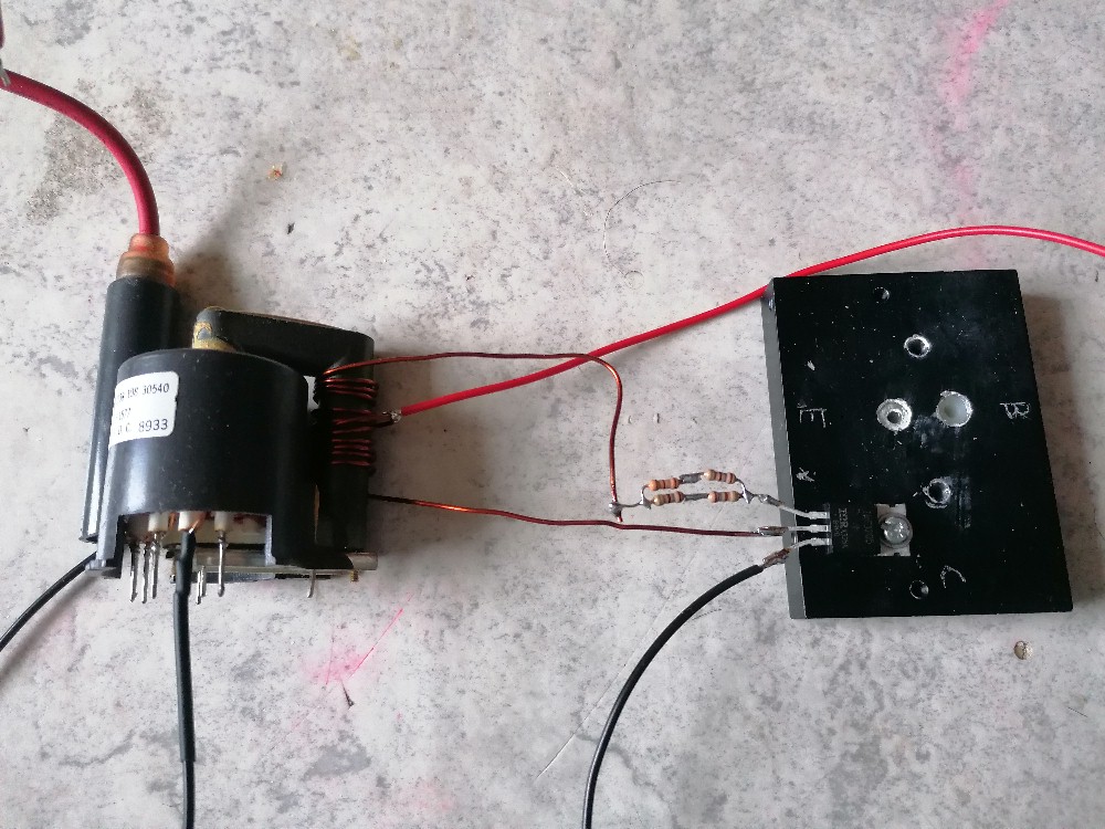 Der Output ist nicht gerade berauschend und viel höher als ca. 4-5 V kann man auch nicht gehen, da sonst der Strom massiv ansteigt. Beim kurzen Betrieb ist mir zudem ein Mosfet gestorben. Insgesamt kann ich daher die Schaltung nicht empfehlen, trotz ihrer Einfachheit. Da ist etwa die Zerhackerschaltung mit dem NE555 oder die ZVS-Schaltung mit den beiden IRFP250 deutlich besser…