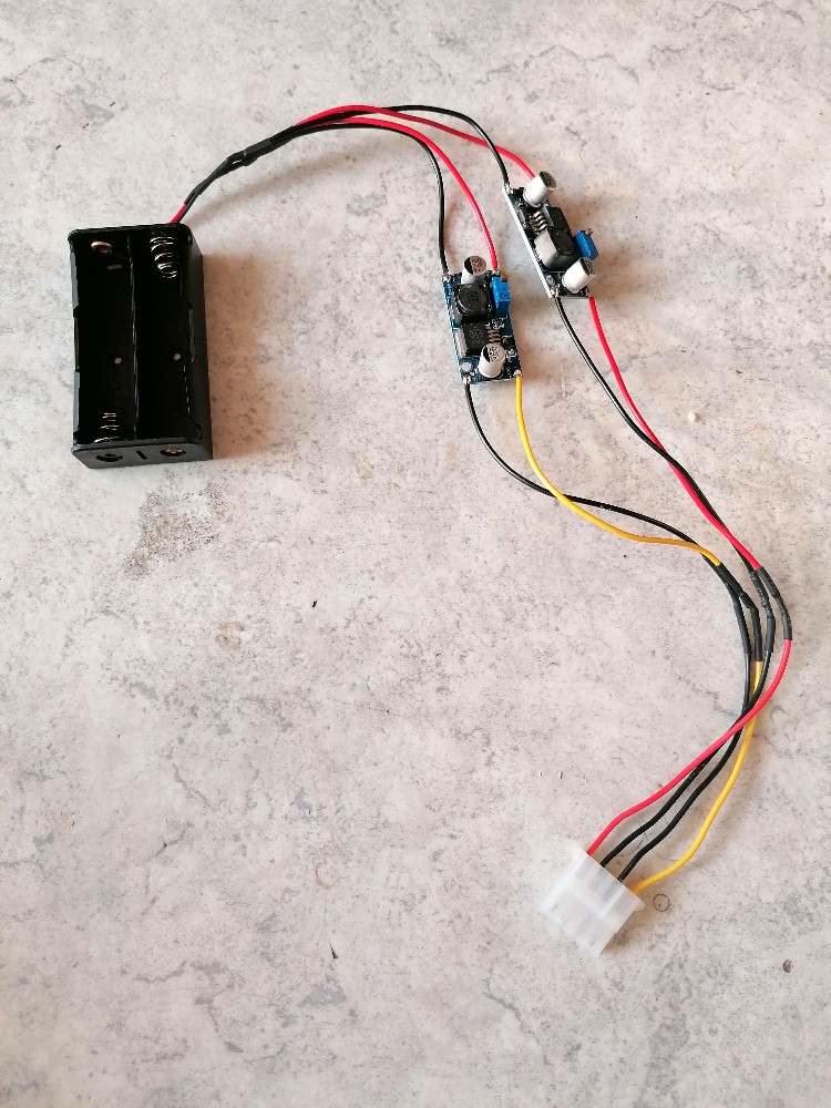 Für die Spannungsversorgung habe ich mir ein kleines 12V/5V-Netzteil gebastelt. Gespeist wird dieses von zwei 18650-Liion-Akkus. Für die 12V benötigt man einen Step up-Wandler (Boost Converter), für die 5V einen Step down-Wandler (Buck Converter). Am Ende wird dann ein Molex-Stecker angelötet mit Gelb = +12V, Rot = +5V, Schwarz = Ground/Minus: