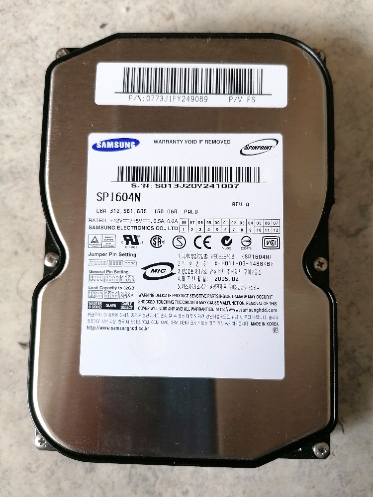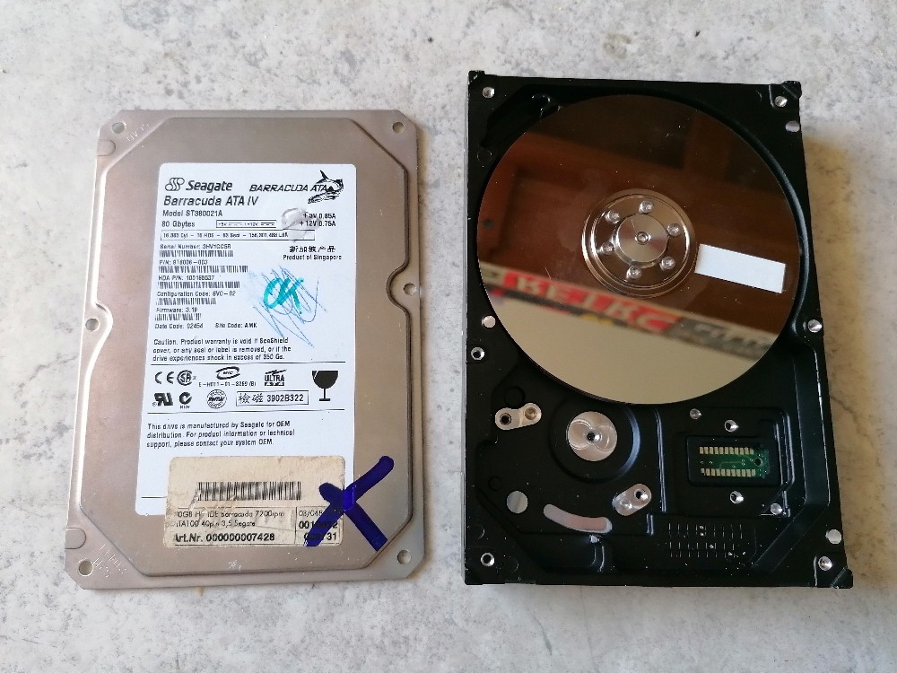 Die erste funktionierende Festplatte war die Seagate Barracuda ATA IV Modell ST380021A mit 80 GB: