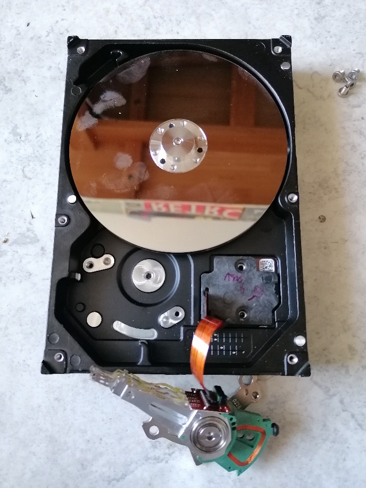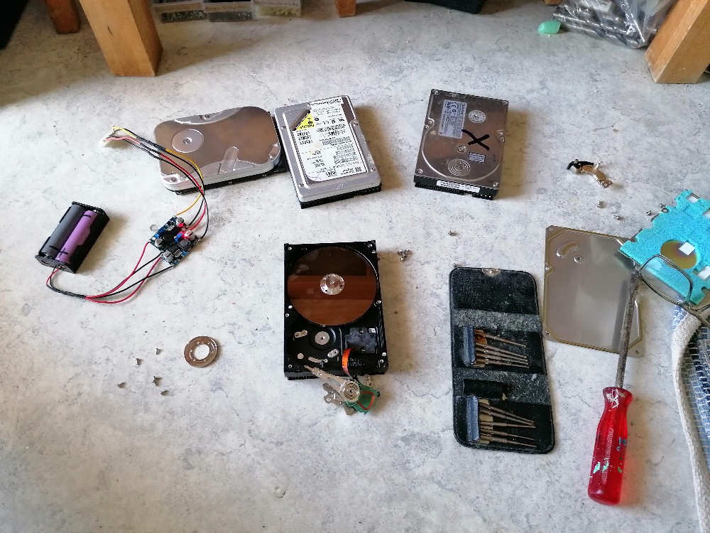 Die 4 weiteren HDD sind angekommen und ich konnte sie gleich testen. Bei 2en drehte sich der Motor überhaupt nicht, bei den anderen beiden jedoch ohne Probleme. Jetzt kam aber die Stunde der Wahrheit: Dreht er sich auch noch ohne Lesekopf? Und ja, beide drehten sich anstandslos und fuhren nicht etwa nach kurzer Zeit wieder runter. Im microcontroller.net Forum wurde mir ja prophezeit, dass keiner der Motoren sich drehen wird. Da ich mich aber von solchen Dingen nicht abhalten lasse, überprüfte ich es getreu dem Motto „Probieren ist besser als Studieren“ praktisch und hatte Erfolg. Wenn ich immer nach solchen Unkenrufen gegangen wäre, hätte ich wohl 50% meiner Physikprojekte nicht umgesetzt.