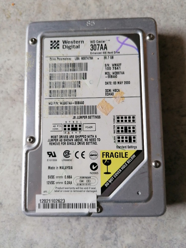 Die zweite funktionierende Festplatte war die Western Digital WD Caviar 307AA mit 30.7 GB: