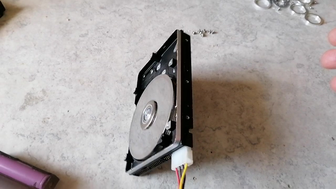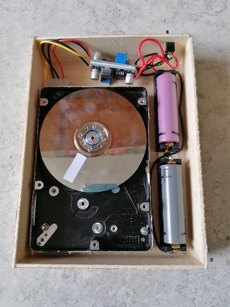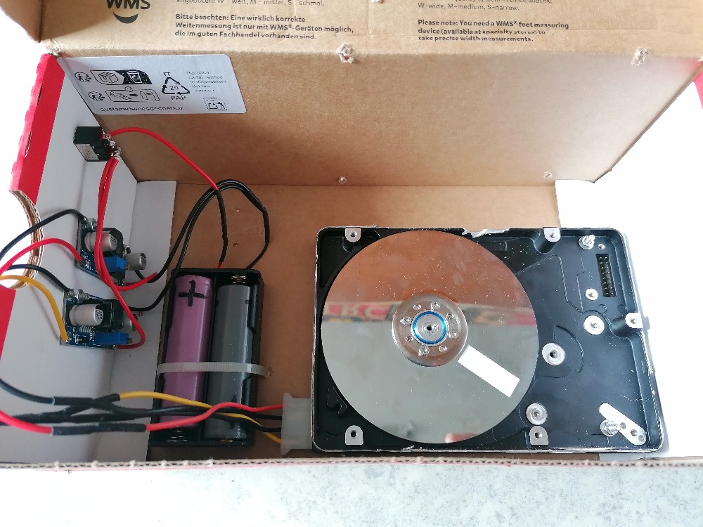 Um alles so kompakt wie möglich zu gestalten, ging ich von zwei seriellen 18650-Akkus auf einen einzelnen zurück in Kombination mit zwei kleineren step up Wandlern. Jetzt lief der Motor aber gar nicht mehr an. Also wieder zurück zu 2 Akkus und stärkeren Spannungswandlern. Bei 8 V Versorgungsspannung zieht der Aufbau zu Beginn beim Anfahren immerhin rund 3.5 A. Zur Fixierung der Festplatte habe ich mir noch längere 6-32 UNC Schrauben besorgt. Wenn diese angekommen sind, kann ich den Aufbau fertigstellen…