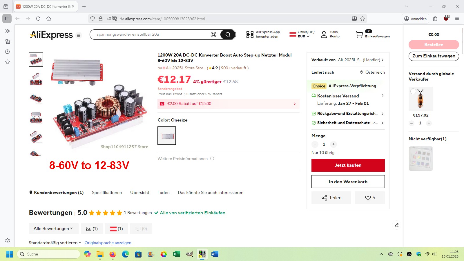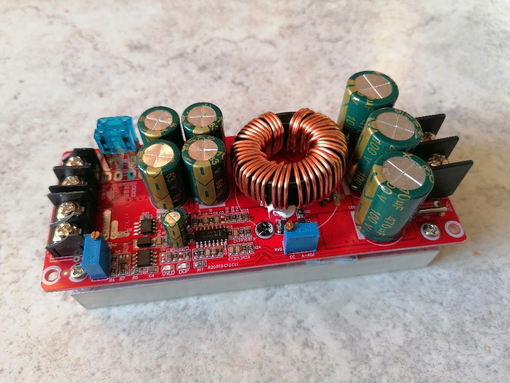 Für die 4 MHz class-e Teslaspule hätte ich unlängst ein Netzgerät mit Spannungen um die 50 V benötigt. Ich habe mich dann für die Kombination aus meinen Variac mit einem Brückengleichrichter + Glättung entschieden. Da ich aber hin und wieder ein galvanisch vom Netz getrenntes Netzteil mit Spannungen bis ca. 50–90 V benötige, habe ich mich zunächst auf Amazon umgesehen. Dort gibt es 0–60 V/5 A Labornetzteile ab ca. 60 Euro. Ich bin aber auch auf einen deutlich günstigeren Step-up-converter mit 1200 W/20 A gestoßen, welchen man ab ca. 12 Euro bekommt:
