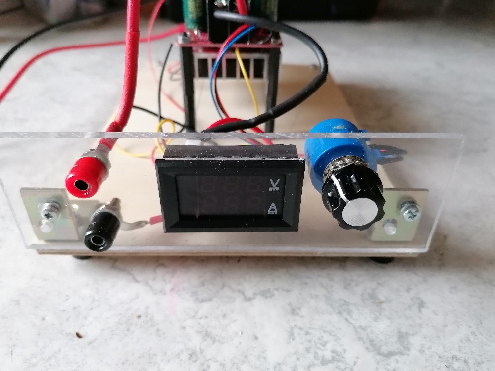Die Kosten für das gesamte Labornetzteil belaufen sich auf nur rund 25 Euro. Belohnt wird man mit einem 0-18V/6A Netzteil. Ich habe nur das Potentiometer für die Spannungsregelung nach außen gelegt. Man kann dies aber auch für die Stromregelung machen (siehe zweites blaues Potentiometer auf dem Buck-converter).