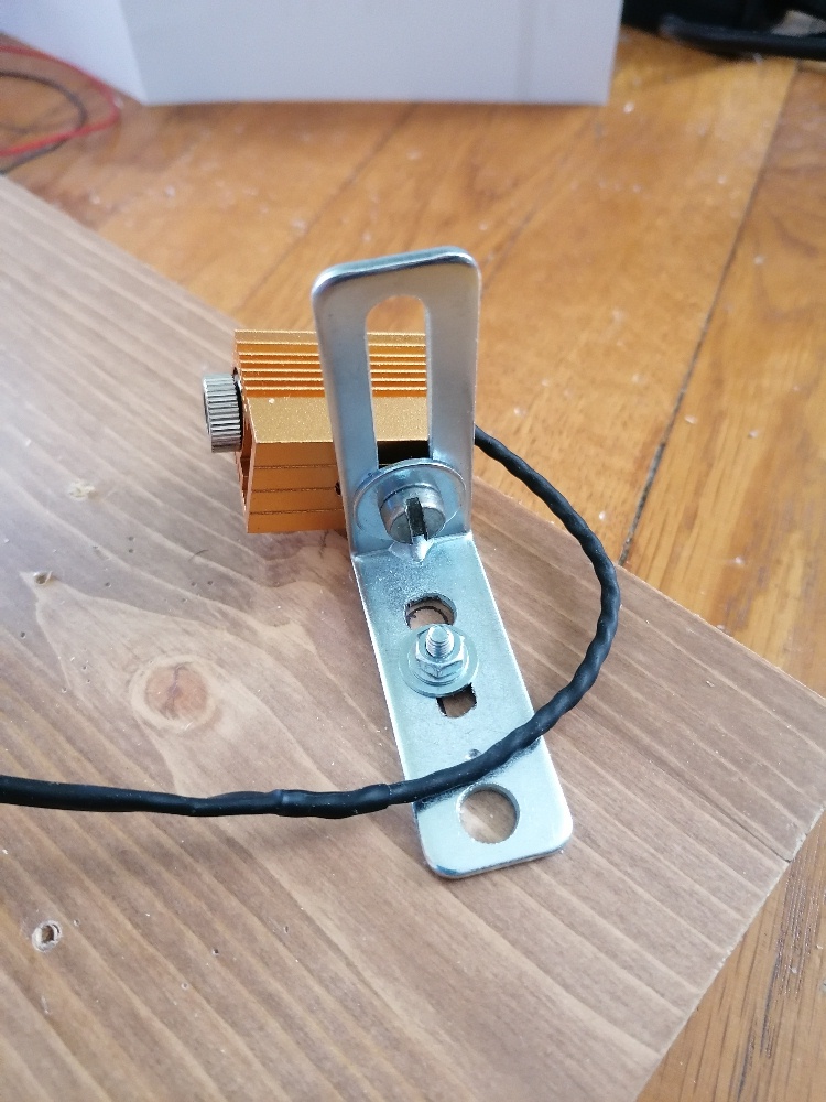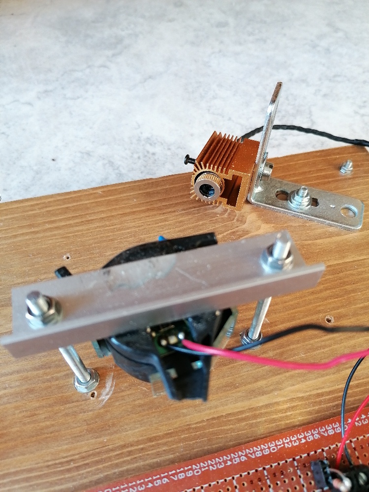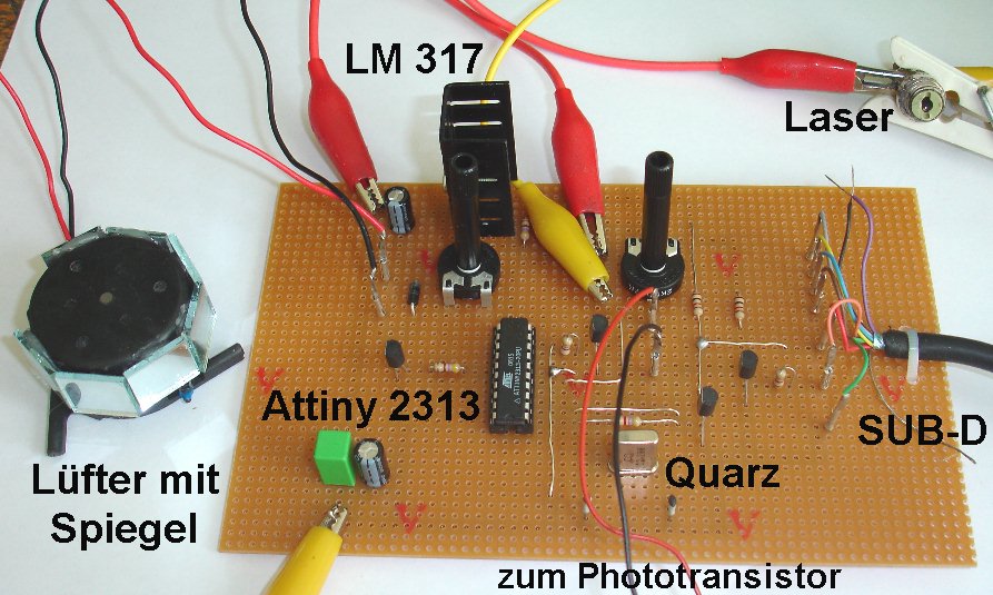 So blieb mir nichts anderes übrig als auf die ganze Motorsteuerung zu verzichten und den Lüftermotor einfach mit einem LM317 fix zu betreiben. Zur Grobeinstellung der Spannung verwende ich ein 10-Gang-Potentiometer mit 1 kOhm Widerstand, zum feinen Regulieren betätige ich dann das 100 Ω-Potentiometer. So kann ich die Motorspannung sehr fein justieren. Dies ist auch notwendig, da ich sonst die sich immer wieder einmal verziehende Laserschrift auf der Leinwand nicht wieder schön gerade bekomme.