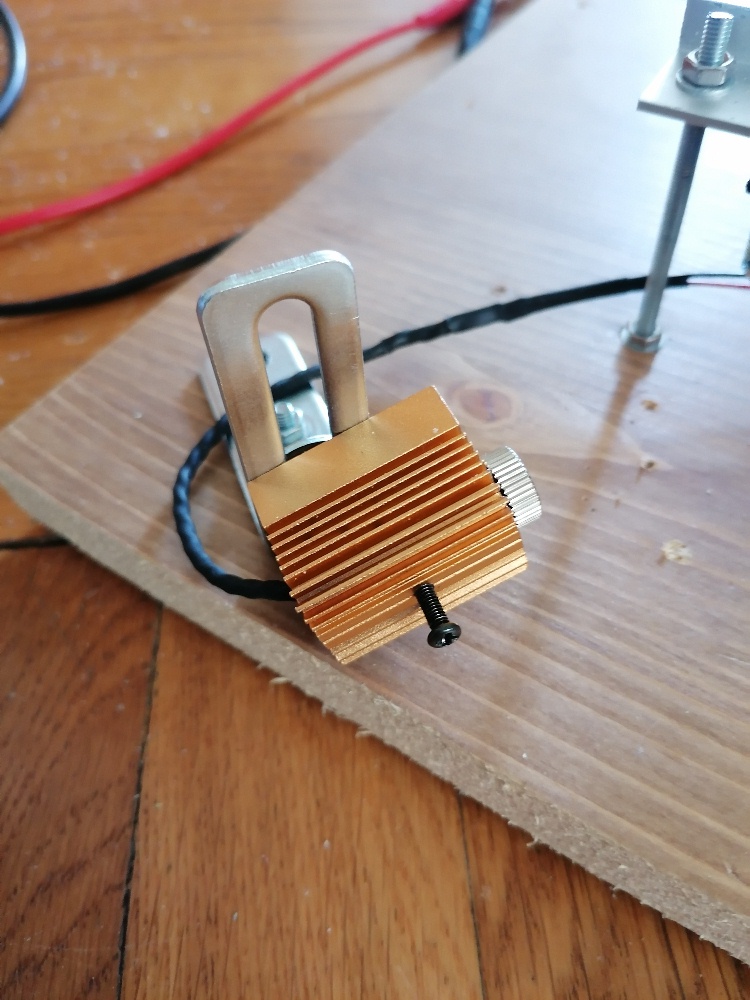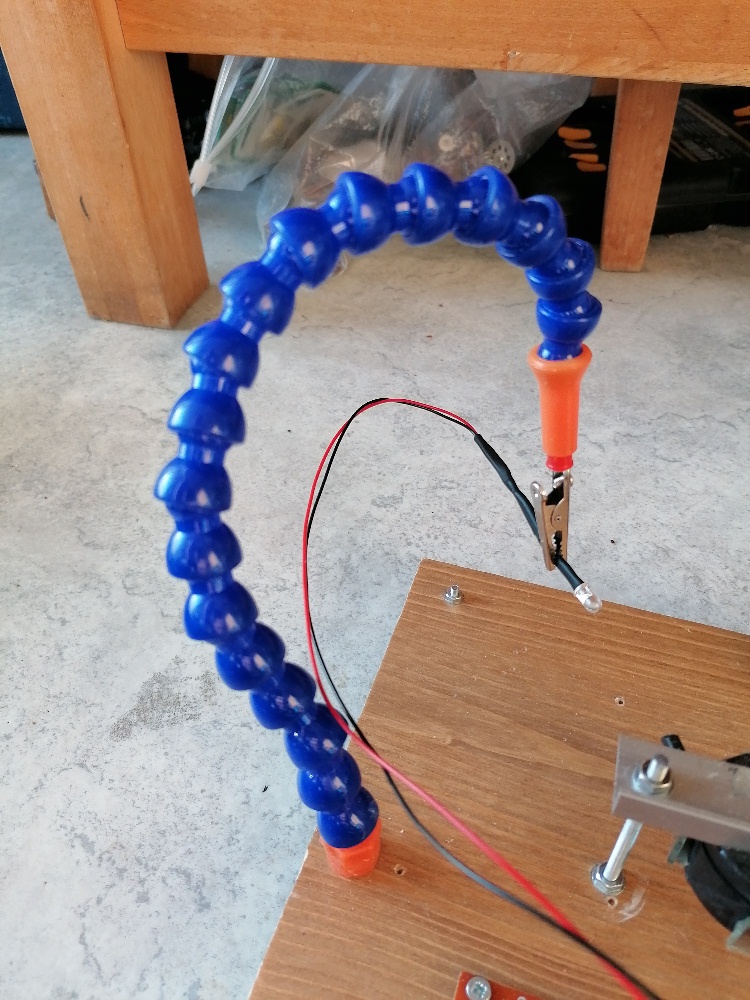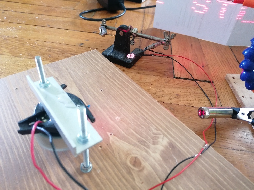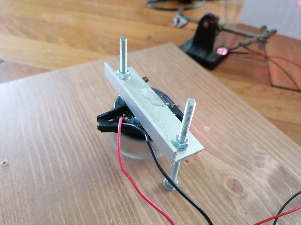 Durch die vielen umgesetzten Physikprojekte habe ich eigentlich fast immer das benötigte Teil lagernd zuhause, so auch in diesem Fall bzgl. Lasergehäuse und Metallwinkel. Durch die Längslöcher kann ich den Laser sehr gut flexibel ausrichten. Gleiches gilt auch für die Photodiode, wobei ich für diese einen Plastikschwanenhals von einer Löthilfe verwendete:
