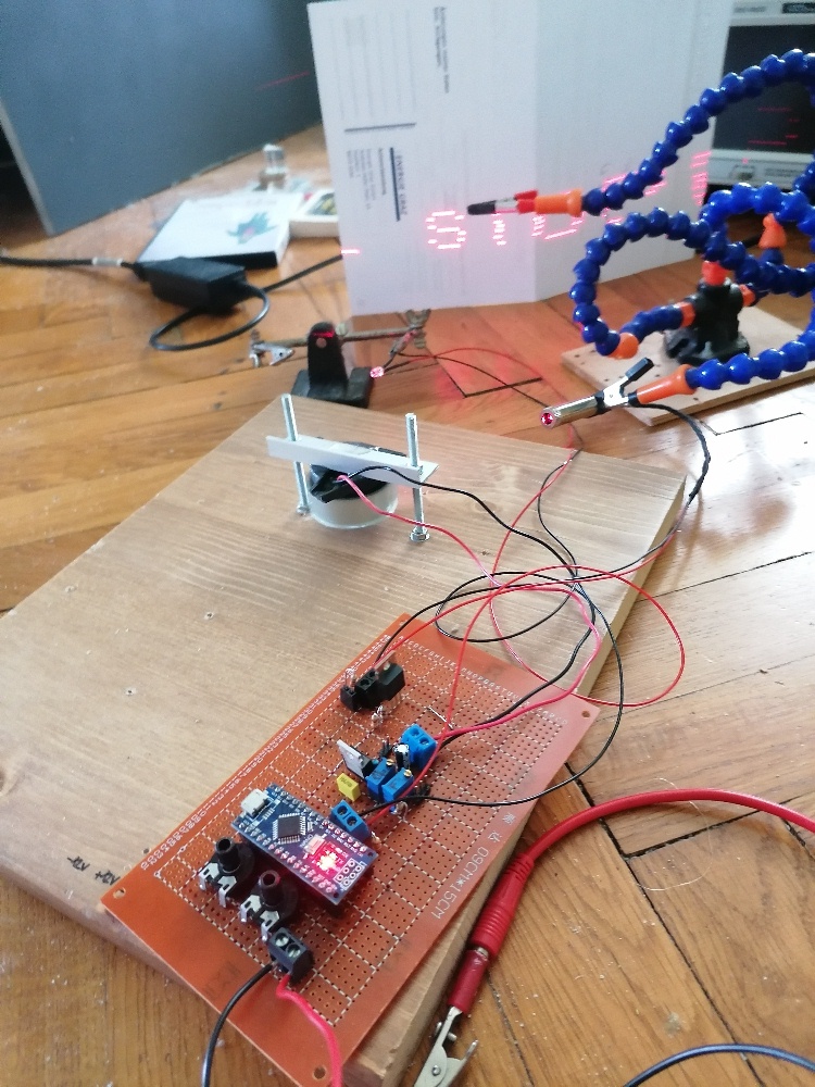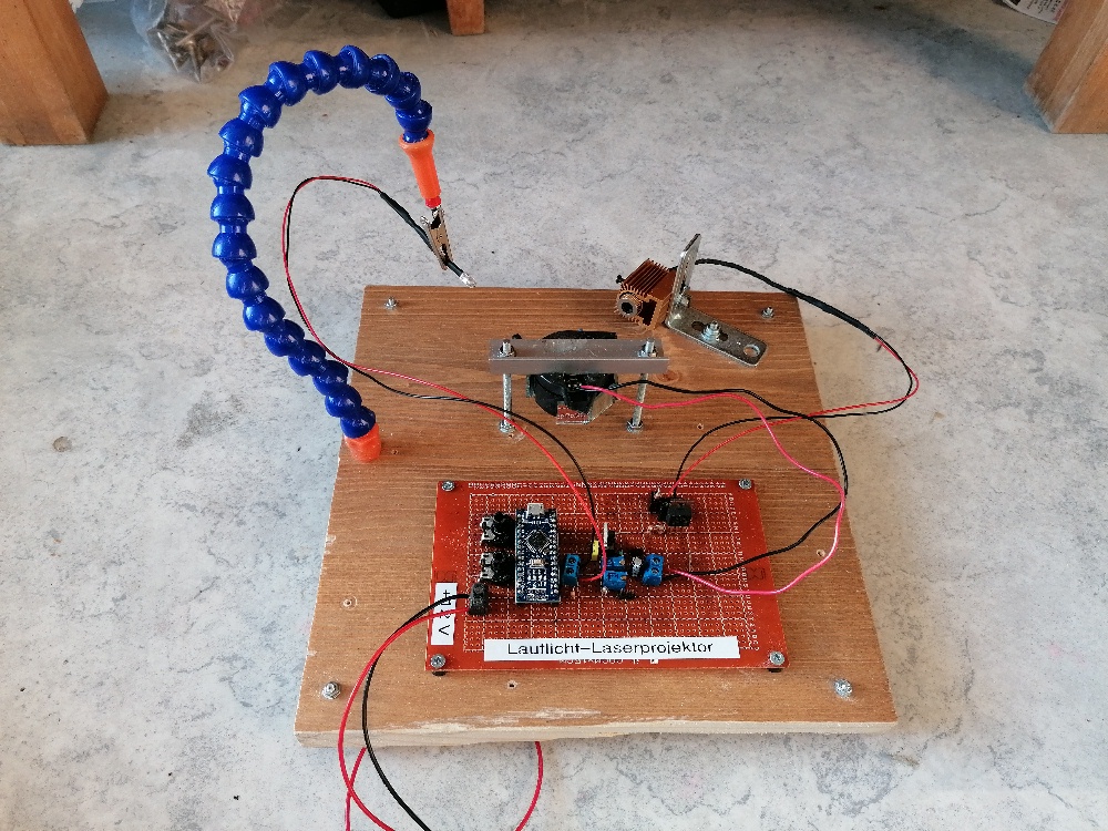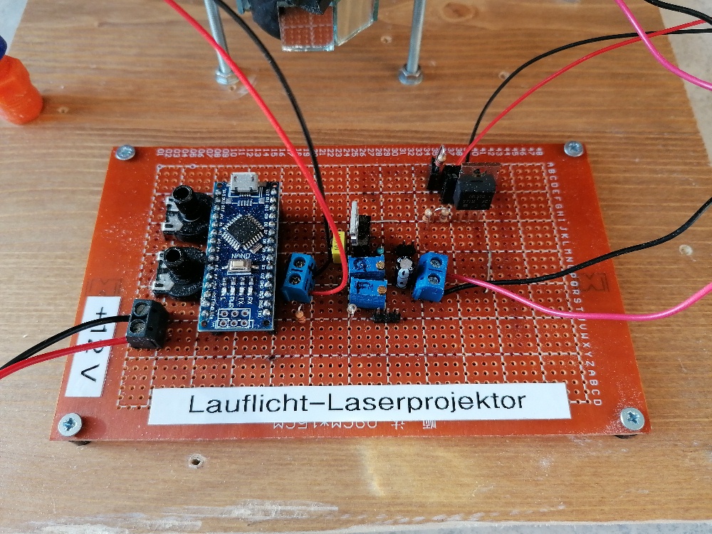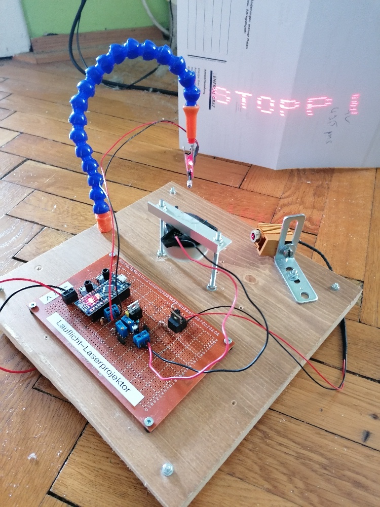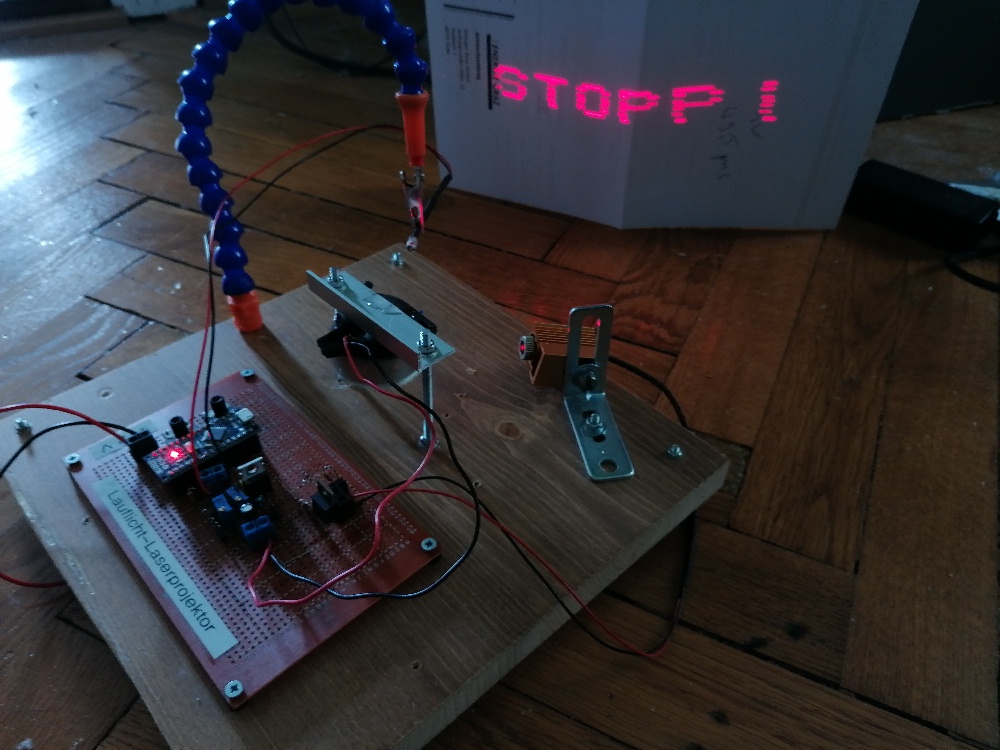 Die Justage des Laserscanners ist ziemlich fummelig. Auf der Platine befindet sich zum Abgleich extra ein (eigentlich zwei) Potentiometer. Mit diesem verändere ich die Wartezeit so lange, bis das Lasermuster passt. Die Linien werden bei mir von unten nach oben gezeichnet. Daher ging ich bei der Justage wiefolgt vor: Zuerst gab ich „IIIII“ als Text ein, da der Buchstabe I leichter zum abgleichen ist. Danach stellte ich die Verzögerung der untersten Zeile mit dem Index 7 ein. Der kurze Strich des I’s sollte nicht zu knapp, aber auch nicht zu weit von der Photodiode entfernt von der Photodiode projiziert werden. Über den Serial.print-Befehl ließ ich mir dann den passenden Wert für die Verzoegerung_2[7] ausgeben und wies dieser Variable dann fix den Wert zu. Danach veränderte ich für die zweite Zeile die Verzoegerung_2[6] so lange, bis der kurze Strich des I’s in der zweiten Zeile genau über jenem in der ersten/untersten Zeile lag. Wieder den perfekten Wert für Verzoegerung_2[6] ausgeben lassen und dann der Variable fix zuweisen. Jetzt ging es in die dritte Zeile von unten und wieder veränderte ich über das Potentiometer den Wert Verzoegerung_2[5] so lange, bis das die untere Form des I’s passte. Und so machte ich weiter bis zur obersten Zeile. Zum Schluss hatte ich für alle 7 Variablen Verzoegerung_2[1 bis 7] passende Werte gefunden.