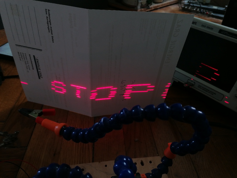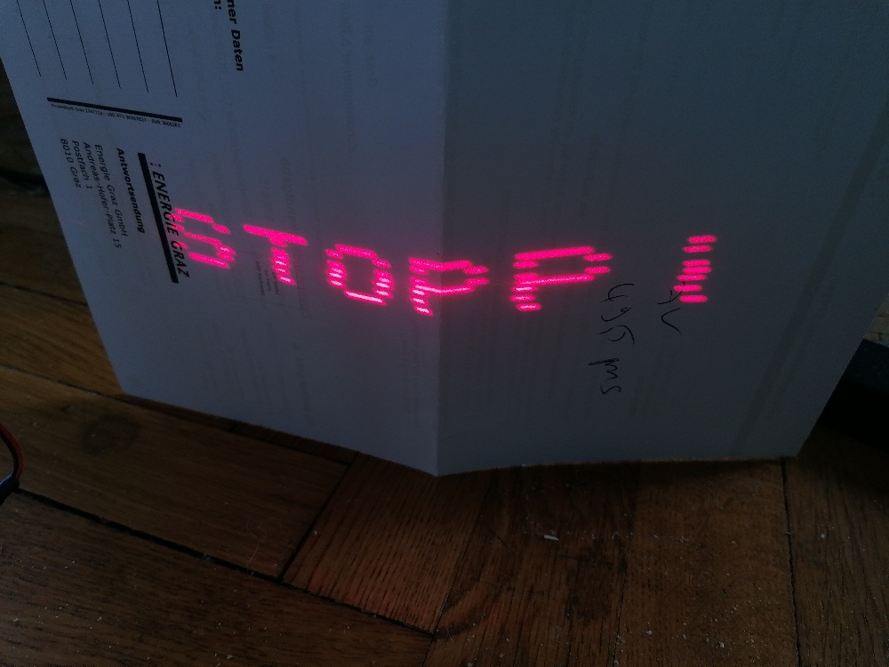 Würde ich nun einen weiteren Buchstaben zum Wort hinzufügen, müsste ich alle Verzögerungen wieder abändern. Gut, pro neuem hinzugefügten Buchstaben müsste der delay um 490 µs reduziert werden, aber das passt nicht ganz genau. Daher habe ich einfach 2 weiter Leerbuchstaben (Laser immer off) hinzugefügt und das Schriftbild damit abgeglichen. Wenn ich nun ein Wort mit mehr oder weniger Buchstaben verwenden möchte, ist dies nun kein Problem mehr und ich ersetze z.B. einen der beiden Leerbuchstaben durch einen echten. Dann müsste ich theoretisch nichts mehr nachjustieren müssen…