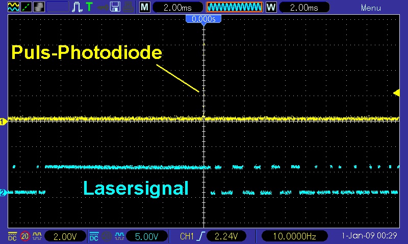Hier sieht man oben in Gelb den schmalen Photodiodenpuls. Unten in türkis dann die darauffolgende Laseransteuerung. Nach 8 Buchstaben sollte der Laser dann auf HIGH gehen, bis der nächste Startpuls der Photodiode eintrudelt: