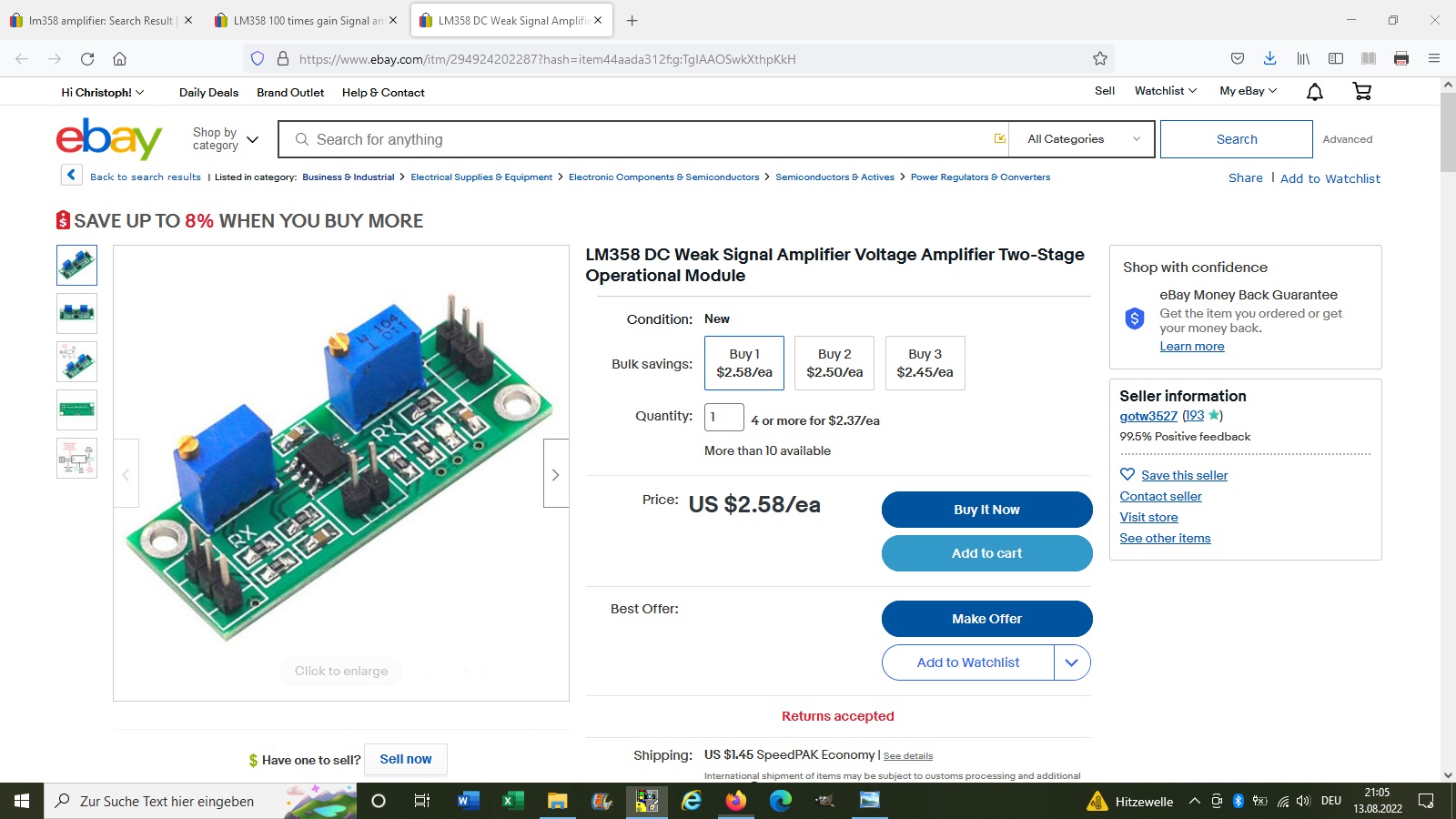 Für die Schaltung benötigt man noch ein 2-stufiges Verstärkermodul mit dem LM358. Dieses erhält man für um die 5 Euro im Internet: