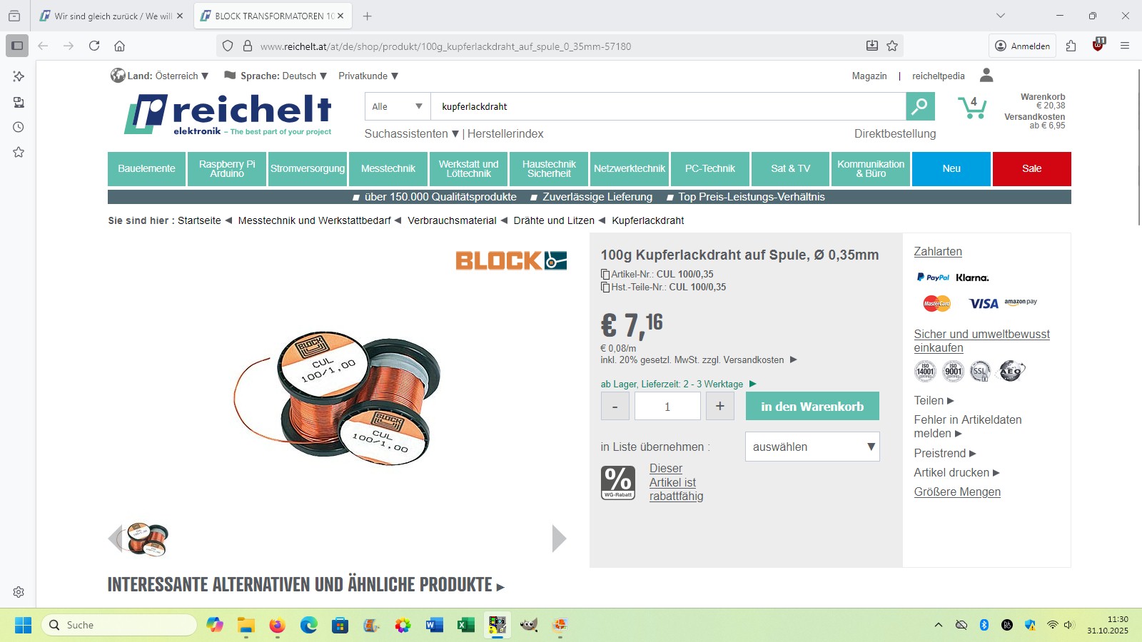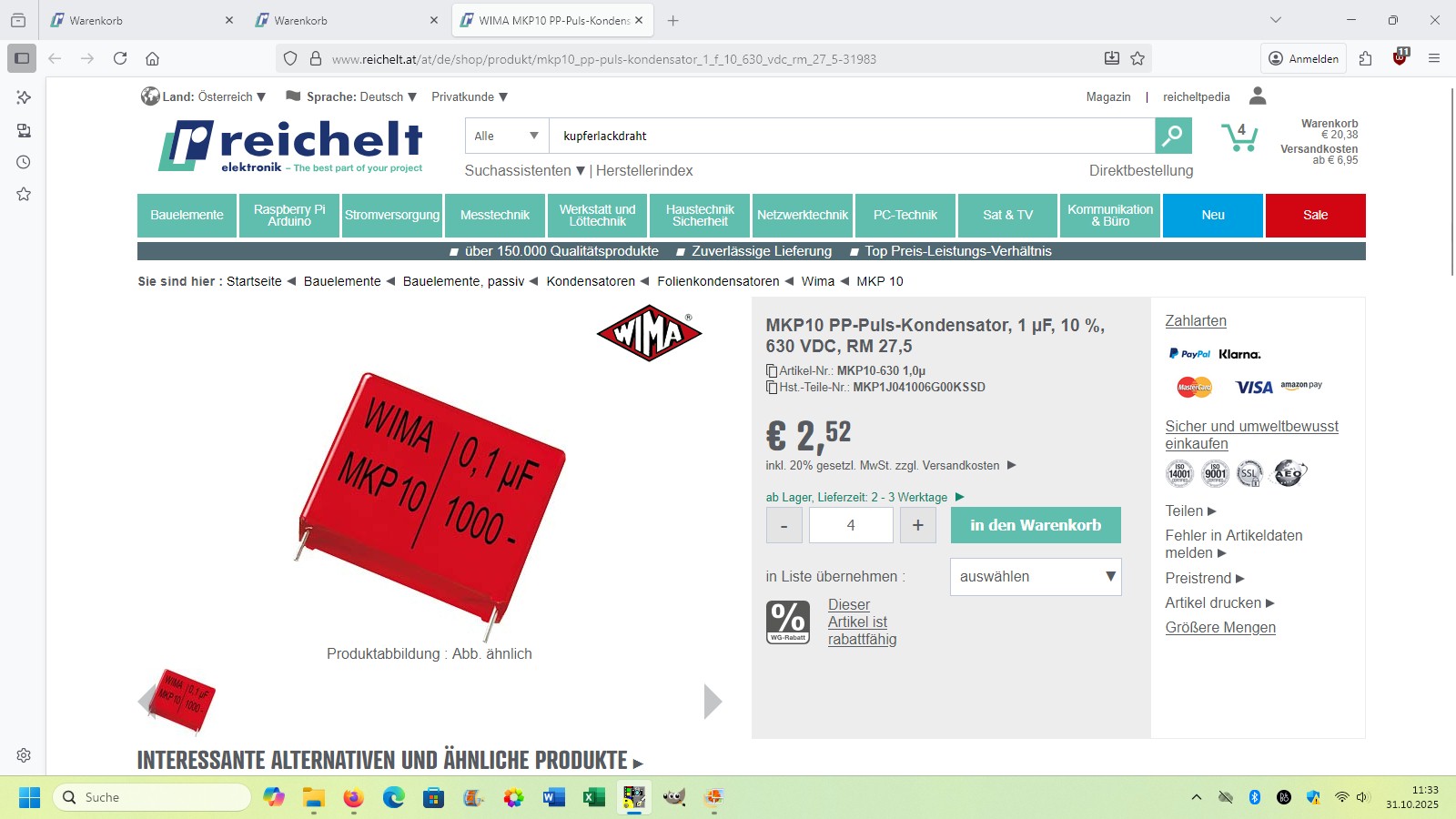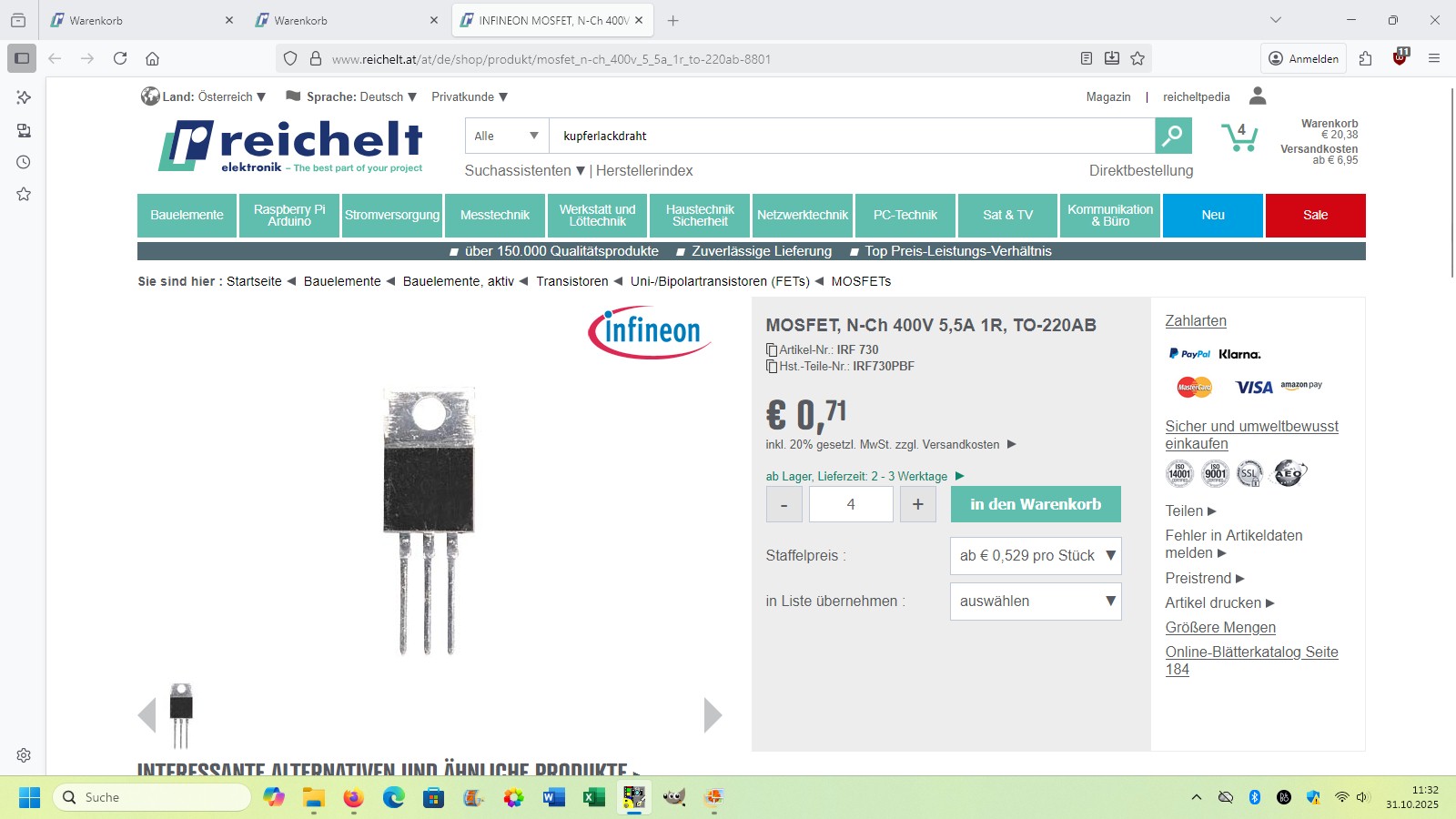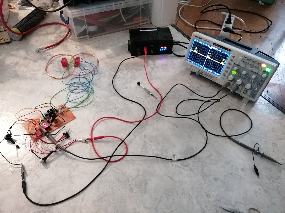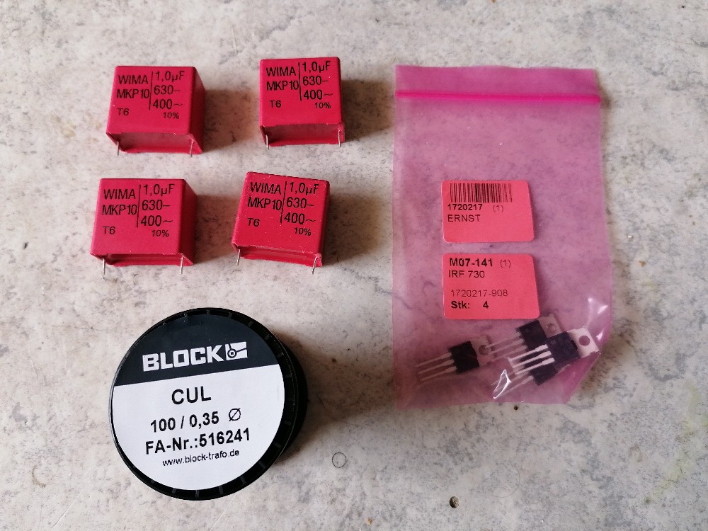 Die meisten Bauteile hatte ich bereits zuhause. Nur Mosfet (IRF730), Kupferlackdraht (0.35 mm) und Schwingkreiskondensatoren (WIMA MKP10 1µF) musste ich bei Reichelt bestellen: