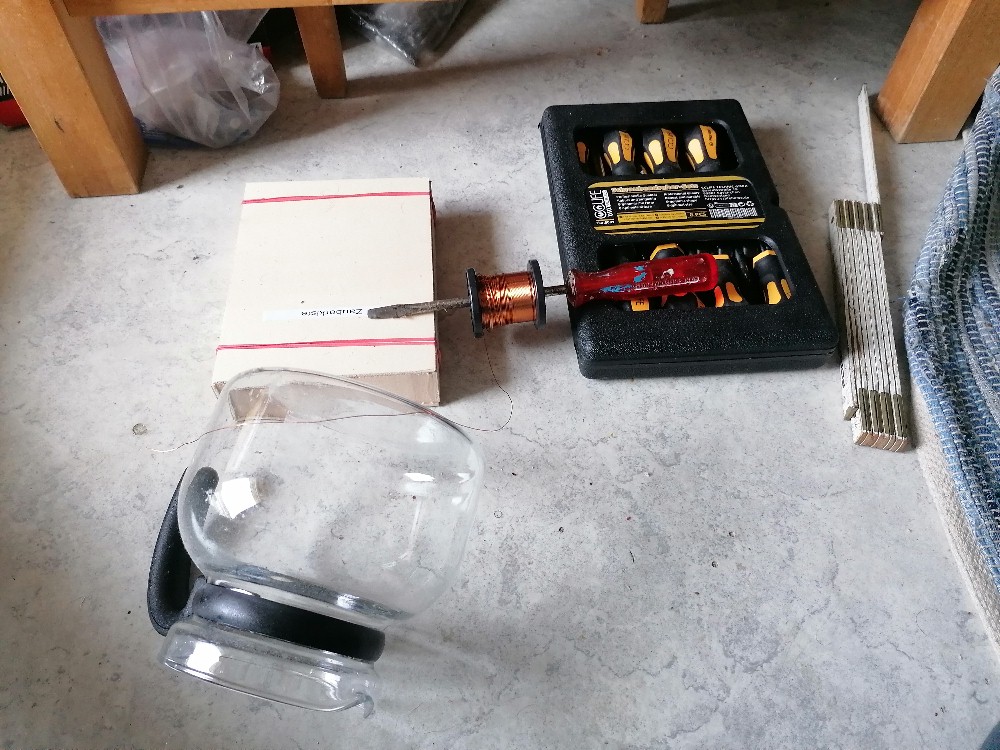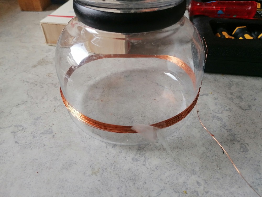 Herzstück eines jeden Metalldektors ist/sind die Detektionsspule(n). Konkret werden für dieses Projekt zwei Spulen aus 0.35 mm Kupferlackdraht mit einem Durchmesser von 150 mm und mit je 60 Windungen benötigt. Zum Glück fand ich in meiner Wohnung etwas mit diesem Durchmesser und zwar meine Kaffeekanne 😉