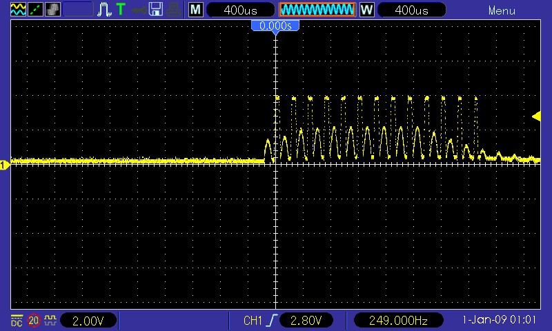Man erkennt schön die rechteckigen Erregerpulse gefolgt von der angeregten Schwingung. Mit dem delay-Potentiometer, welches an den analogen Pin A4 geht, kann man den Zeitpunkt einstellen, an dem nach Beendigung des Erregerpulses die angeregte Schwingung gemessen wird. Es ist ein delay von 0 bis 1023 µs einstellbar.