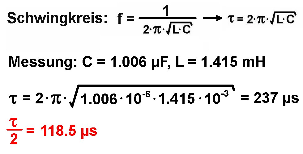 Mit diesen Werten konnte die Frequenz bzw. halbe Periodendauer der beiden Schwingkreise berechnet werden. Ich komme auf einen Wert von τ/2 = 118.5 µs.