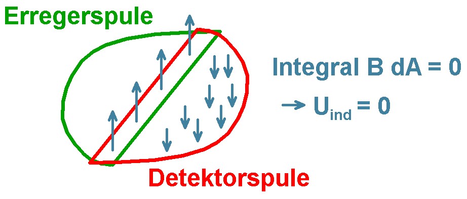 Wählt man die Überlappung geschickt, so ist der insgesamt die Detektorspule durchsetzende magnetische Fluss Φ insgesamt konstant 0! Dadurch ist auch die Induktionsspannung Uind ≡ dΦ/dt gleich 0. Es wird also bei dieser Konstellation keine elektrische Spannung in der Detektorspule induziert, auch wenn sich das Magnetfeld in der Erregerspule zeitlich ändert.