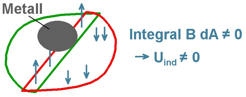Dies führt zu einem Ungleichgewicht zwischen nach oben und nach unten gerichteter Feldlinien in der Detektorspule. Der gesamte die Detektorspule durchdringende magnetische Fluss Φ ist jetzt nicht mehr 0! Ändert sich nun der Strom und damit das Magnetfeld in der Erregerspule. so ändert sich auch der magnetische Fluss in der Detektorspule, da nicht mehr immer 0. Es kommt infolgedessen zu einer Induktionsspannung in der Detektorspule, voila…