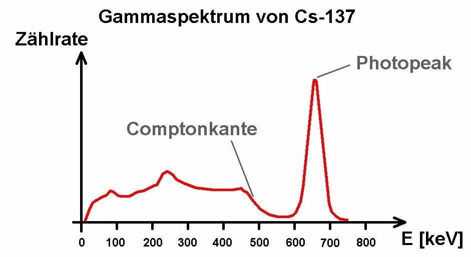 Im letzten Spektrum ist der Photopeak von Cäsium-137 bei 662 keV sehr schön zu sehen. Auch tritt die sog. Comptonkante sehr gut hervor.