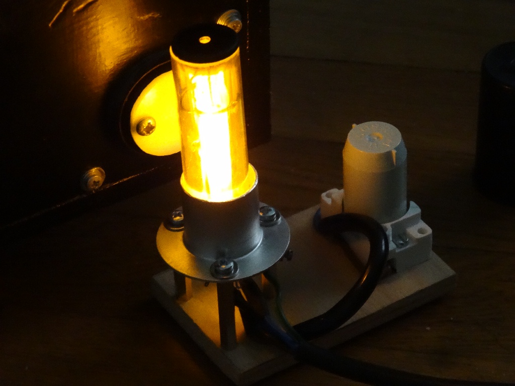 Das mit gasförmigen Jod gefüllte Glasgefäß zwischen Weißlichtquelle (50W Halogenlampe) und dem Eintrittsspalt des Spektroskops: