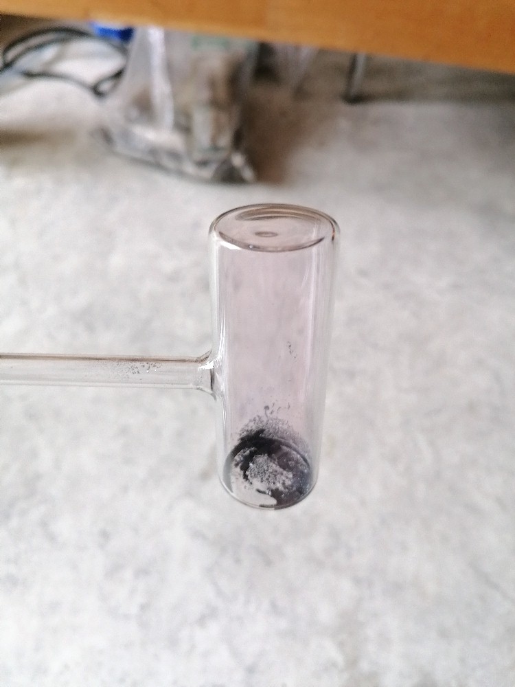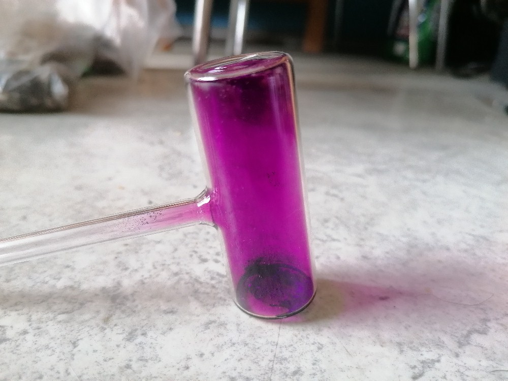 Erhitzt man das Gefäß mit einer Flamme, so geht das Iod in den gasförmigen Zustand (Siedetemperatur bei Normaldruck lediglich 184.3 °C) über. Das Gas ist auffallend pink gefärbt: